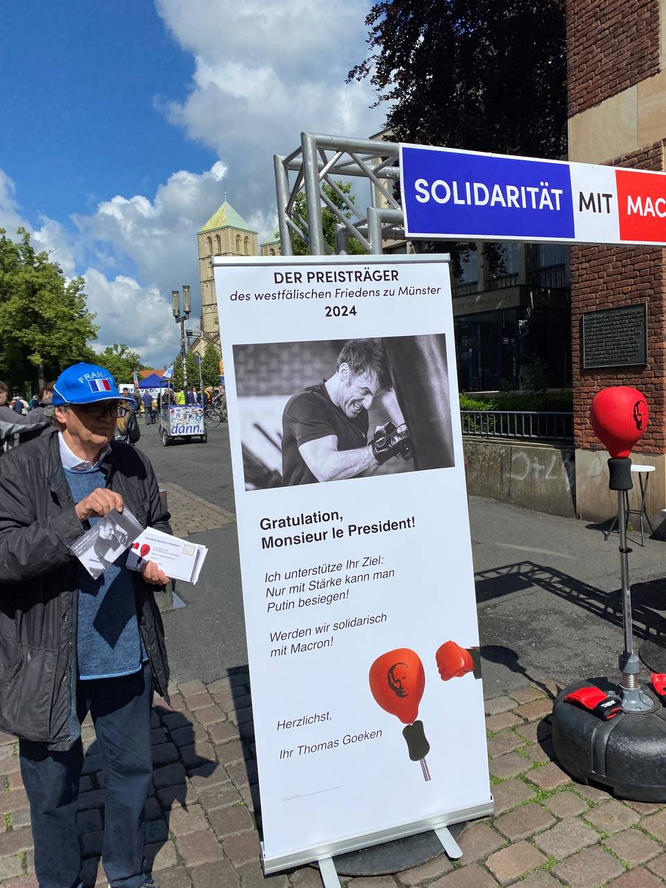 Den Preis nahm Macron heute im Rahmen seines Staatsbesuches in Deutschland persönlich in Münster entgegen. Es ist der erste Staatsbesuch eines französischen Präsidenten seit 24 Jahren. Bundespräsident Frank-Walter Steinmeier hat eine Laudatio gehalten und auch EU-Kommissionspräsidentin Ursula von der Leyen, Ministerpräsident Hendrik Wüst sowie die deutsche Familienministerin Lisa Paus und die polnische Bildungsministerin Barbara Nowacka, nahmen an dem Festakt teil. Paus und Nowacka überreichen den Jugendpreis des Friedenspreises.