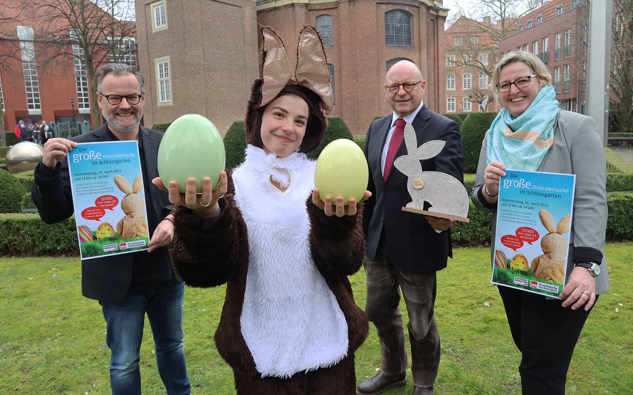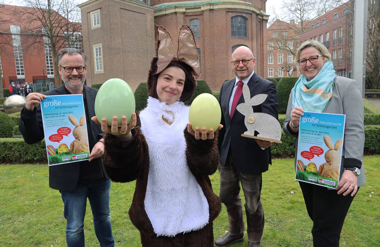 Am heutigen Ostermontag hat der Osterhase einen festen Termin mit allen Kindern und Familien aus unserer Stadt. Um Punkt 11 Uhr werden in diesem Jahr endlich wieder die Schlossgarten-Tore geöffnet. Und dann kann die Suche beginnen. Damit das Gedränge nicht zu groß wird, gibt es für die ganz Kleinen einen abgesperrten Suchbereich. Die Eier stammen allesamt aus Freilandhaltung von Bauernhöfen aus dem Münsterland.