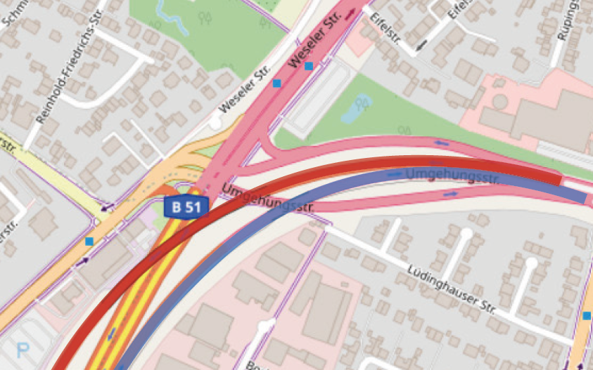 Von Freitagabend (10.10., 20 Uhr) bis Samstag (18.10.) werden beide Rampen der B51 (Umgehungsstraße) zur Weseler Straße voll gesperrt. Während dieser Zeit wird eine Umleitung über das Autobahnkreuz Münster-Süd eingerichtet und ausgeschildert. Da in dieser Bauphase auch Anschlussarbeiten an die Weseler Straße durchgeführt werden, steht im Kreuzungsbereich auf der Weseler Straße nur eine Fahrspur in Richtung Innenstadt zur Verfügung. Straßen.NRW bittet alle Verkehrsteilnehmenden, den Bereich weiträumig zu umfahren und insbesondere in den Morgen- und Nachmittagsstunden mehr Fahrzeit einzuplanen.