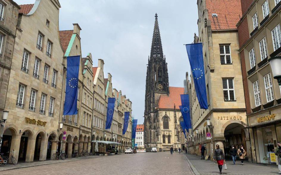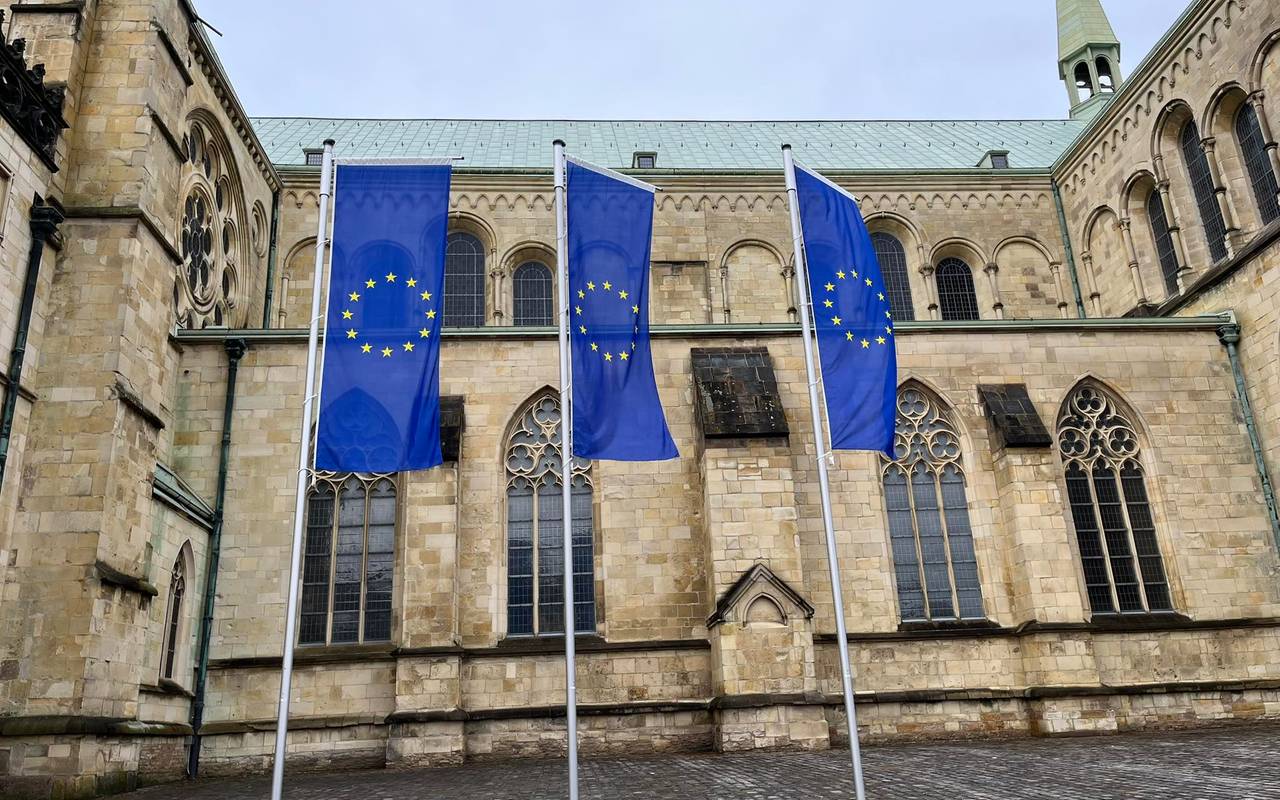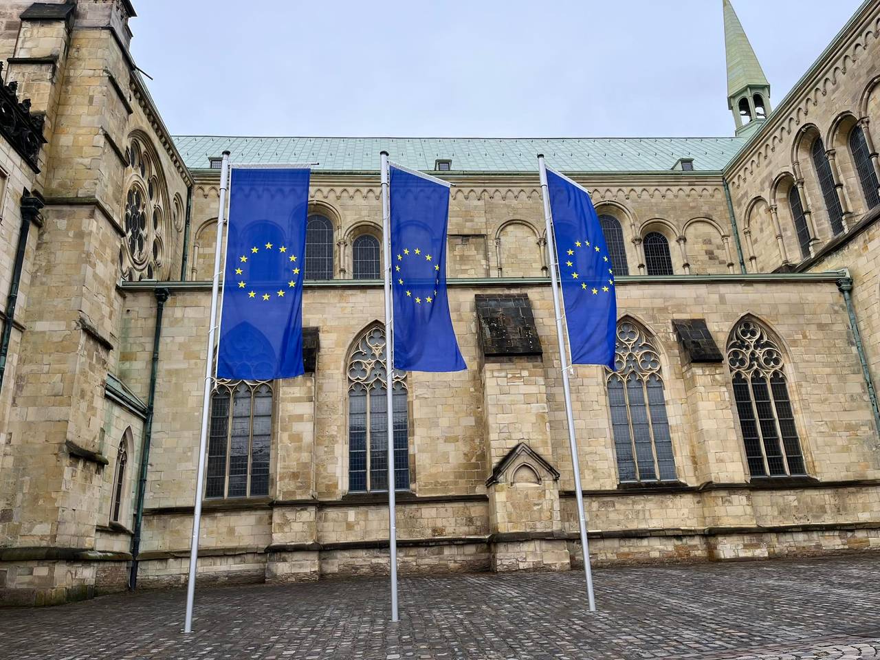 Wegen der Demo gegen den AfD-Neujahrsempfang am Freitag (16.02.) hissen die Kaufleute am Prinzipalmarkt und das Domkapitel blaue Europaflaggen.