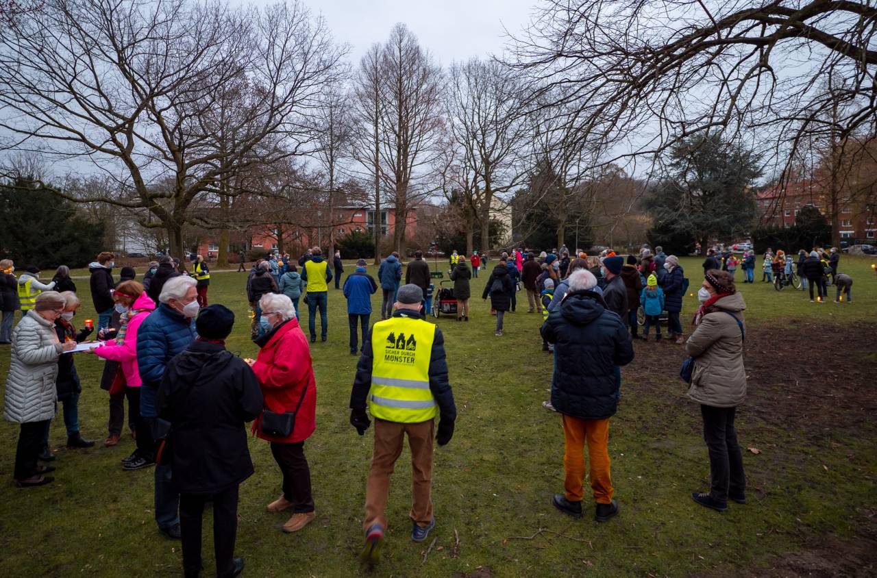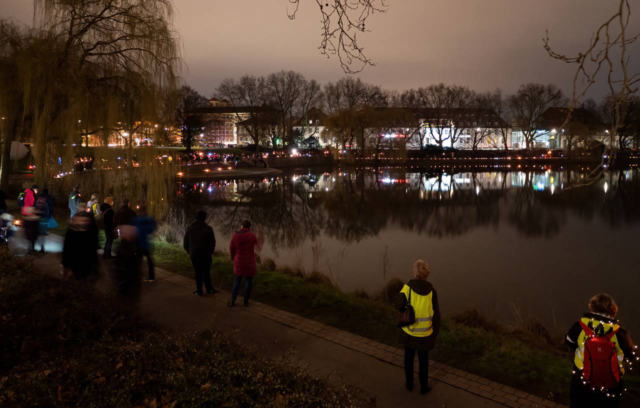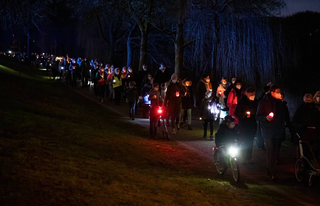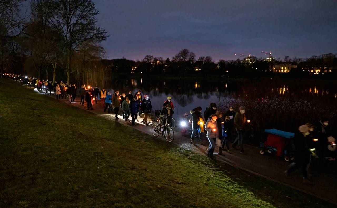 Etwa 380 Gemeindemitglieder:innen der St. Stephanusgemeinde zogen am Samstagabend mit Lichtern und Fackeln von der St.-Stephanus-Kirche zu den Aaseekugeln. Unter dem Motto „St. Stephanus – Licht für Transparenz und Wahrheit“ setzten sie damit erneut ein deutliches Zeichen gegen die geplante Versetzung ihres Pastors Thomas Laufmöller. Gleichzeitig erinnerten sie mit dem Fackelzug das Bistum an das Versprechen, weitere Gespräche zu führen und Verantwortung zu übernehmen. Seit November kämpft die Gemeinde St. Stephanus dagegen an, dass der Pastor versetzt wird - bisher ohne den durchschlagenden Erfolg.