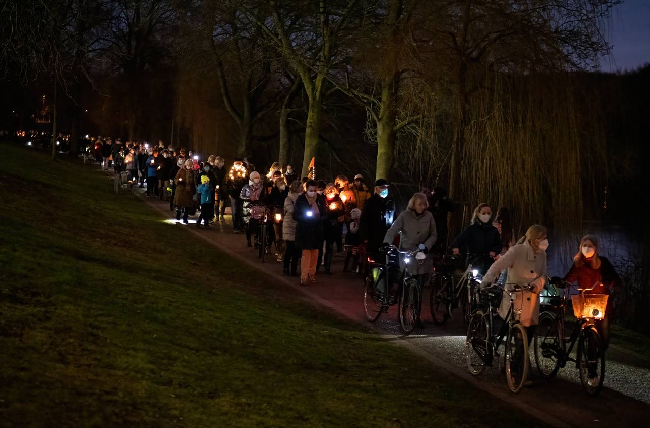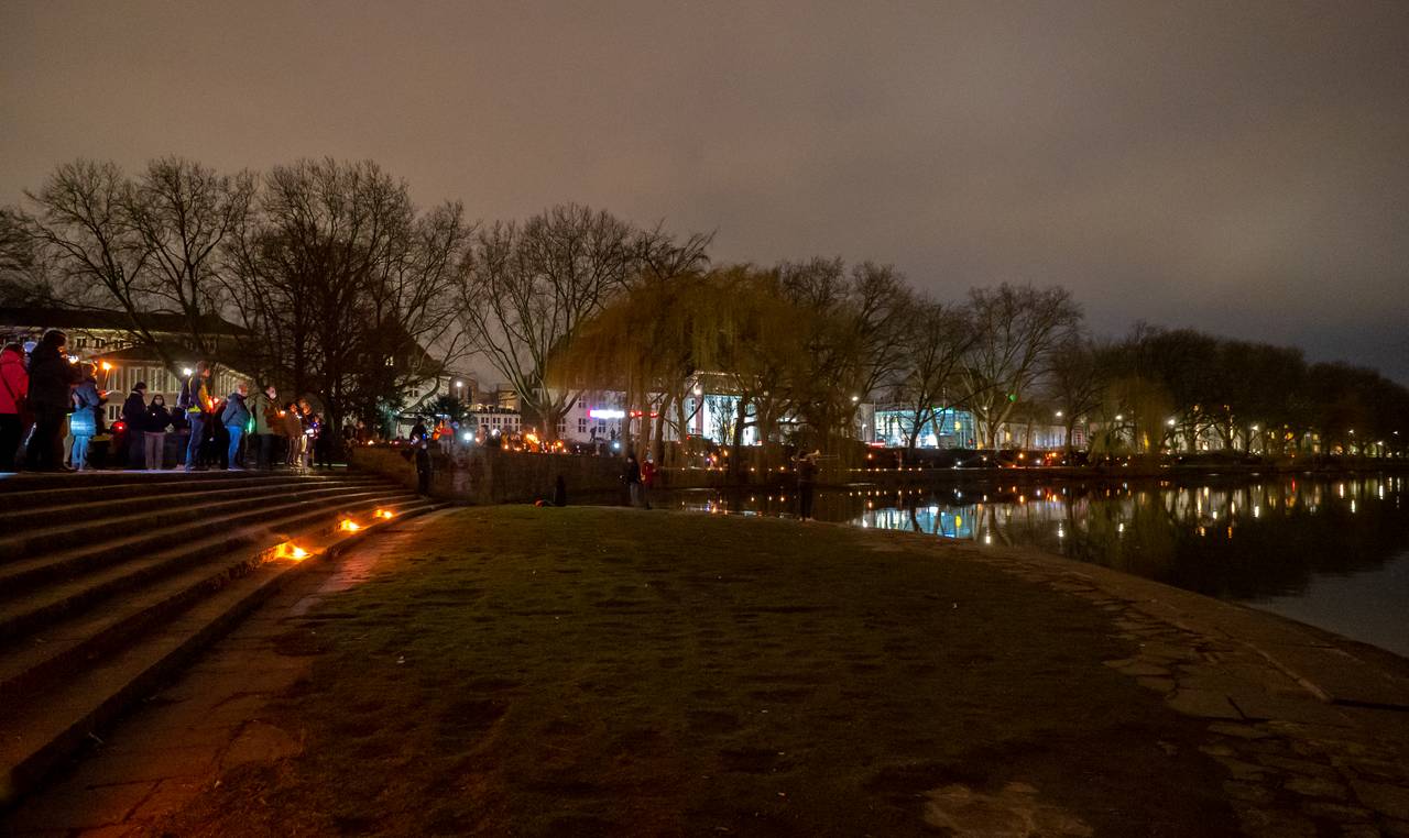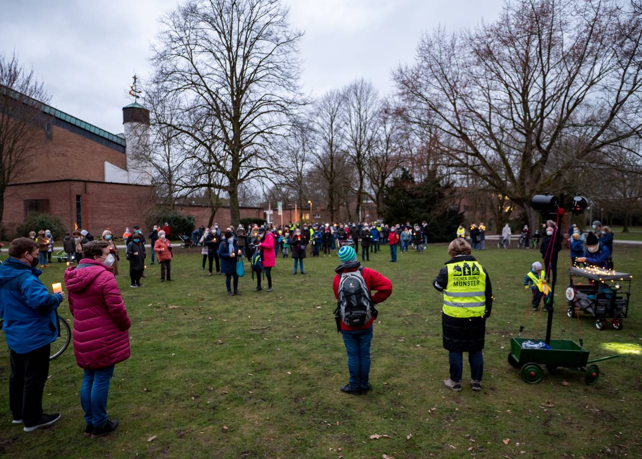Etwa 380 Gemeindemitglieder:innen der St. Stephanusgemeinde zogen am Samstagabend mit Lichtern und Fackeln von der St.-Stephanus-Kirche zu den Aaseekugeln. Unter dem Motto „St. Stephanus – Licht für Transparenz und Wahrheit“ setzten sie damit erneut ein deutliches Zeichen gegen die geplante Versetzung ihres Pastors Thomas Laufmöller. Gleichzeitig erinnerten sie mit dem Fackelzug das Bistum an das Versprechen, weitere Gespräche zu führen und Verantwortung zu übernehmen. Seit November kämpft die Gemeinde St. Stephanus dagegen an, dass der Pastor versetzt wird - bisher ohne den durchschlagenden Erfolg.