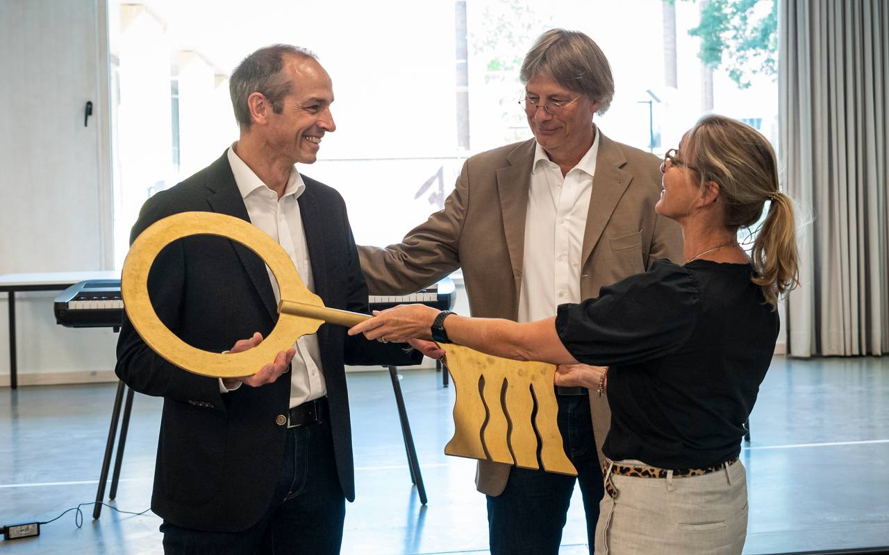 Mit der offiziellen Schlüsselübergabe hat die Stadt den Neubau der Grundschule am Kinderbach und die neue Mensa des Schulzentrums Kinderhaus eingeweiht.