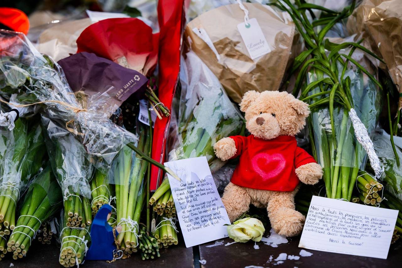 Menschen legen Blumen, Teddys und Botschaften am Brandort ab.© Jean-Christophe Bott/KEYSTONE/dpa