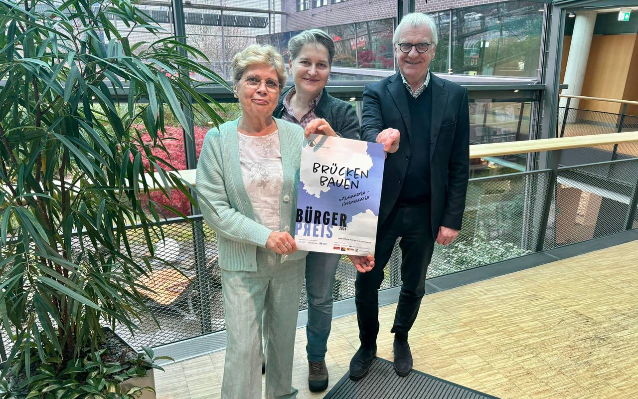 Eine prominent besetzte Jury hat die Finalisten für den Bürgerpreis 2024 ausgewählt. Beim diesjährigen Thema "Brücken bauen - Miteinander Füreinander" haben sich 22 Vereine und Initiativen aus Münster mit ihren Projekten beworben. Projektleiterin Dr. Karin Timmel, Geschäftsführerin Anne Leusmann und Wilhelm Weischer, der Vorstandsvorsitzende der Stiftung Bürger für Münster (v.l.n.r.), haben die Finalisten am Mittwoch (20.11.) vorgestellt.
