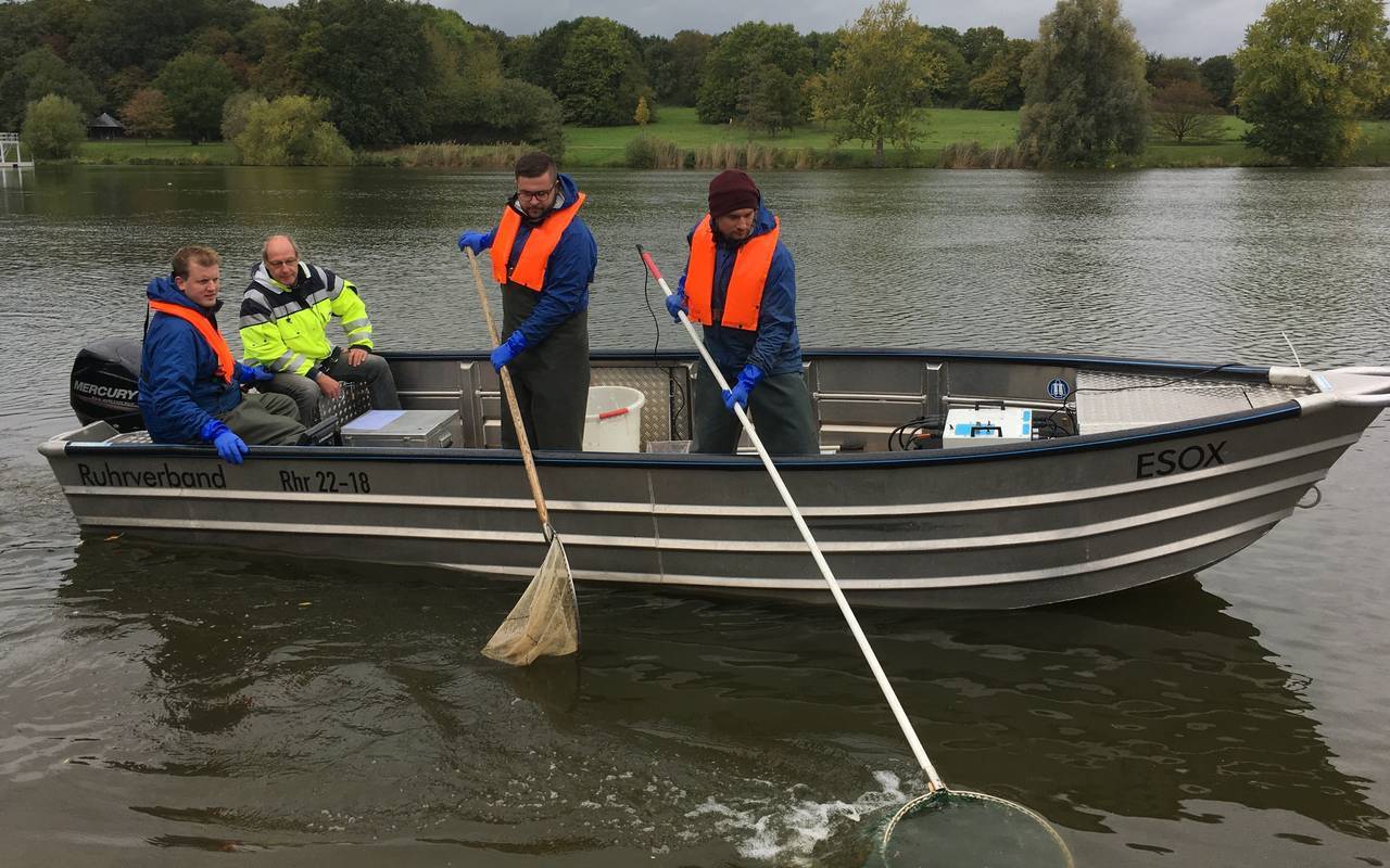 Spaziergänger und Jogger am Aasee sehen ab heute ein Wissenschaftler-Team in ein Aluminium-Motorboot auf dem Wasser. Sie fahren im Schritttempo das Ufer ab und wollen heute und morgen ermitteln, wie viele Fische im Aasee leben. Die Fisch-Population gilt als Anzeiger dafür, in welchem ökologischen Zustand sich ein Gewässer befindet. Gegen 8 Uhr lässt das Team um Markus Kühlmann vom Ruhrverband ihr Boot zu Wasser. Seine Kollegen und er nutzen eine tierfreundliche Methode, um die Fische zu zählen.