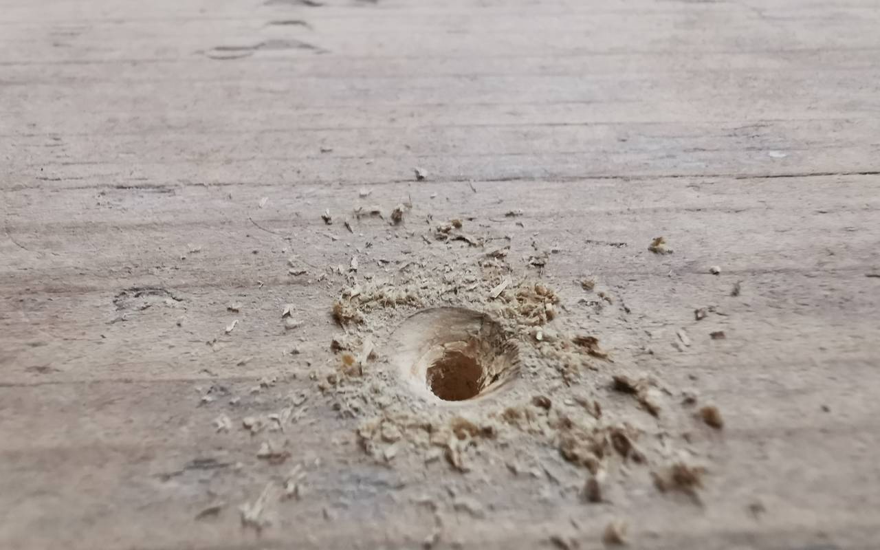 Der Bohrer muss die Holzspäne den ganzen langen Weg nach oben transportieren. Da er das nicht alleine schafft, müssen wir ihm alle paar Zentimeter helfen, indem wir den Bohrer mehrfach aus dem Holz ziehen und wieder eintauchen - bis zum Klebestreifen. Bleiben an den Eingängen Holzspäne zurück, müssen die auch hier unbedingt abgeschliffen werden!