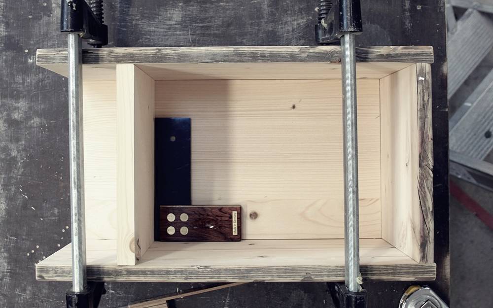 Dann kontrollierst du, ob Boden und Rückwand bündig mit den Seiten abschließen. Wenn keine Lücken zu sehen sind, sollte der Kasten winklig sein (sofern alles rechtwinklig zugeschnitten ist), das kannst du mit einem Winkel aber auch überprüfen. Leg außerdem einmal die Querstrebe oben an, dann siehst du, ob die Position des Deckels passt. Wenn alles richtig sitzt, ziehst du die Zwingen fester an, dass nichts mehr verrutschen kann.
