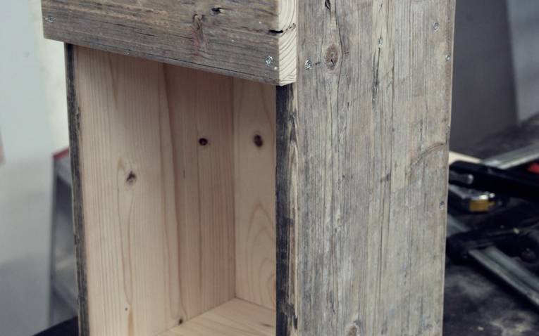 Die Balken kannst du in das Bienenhotel stellen und von hinten je mit einer Schraube fixiert. Pass gut auf, dass du dabei kein Nistloch triffst.