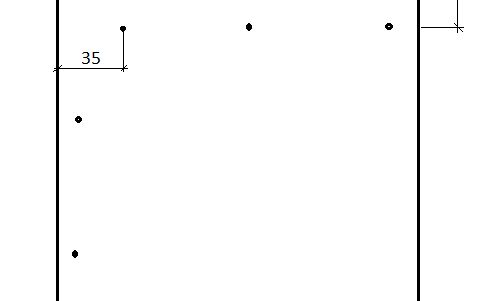 An den den Seiten werden sowohl die Böden als auch die Rückwand verschraubt. Also zeichnest du die Löcher wie folgt an. Das ist nur eine Skizze nach Augenmaß, das Verhältnis der Maße kann in der Realität abweichen.