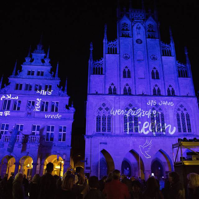 Im Theater diskutieren internationale Friedensforscher:innen und -expert:innen im Rahmen des "Westphalian Peace Summit" und der Veranstaltung "Let's Talk: Peace Beyond Borders". Mit auf dem Podium sitzen etwa der Leiter des ZDF-Studios in Washington, Elmar Theveßen, sowie Forscher:innen aus Stockholm und Schweden. Zum Abschluss der Feierlichkeiten können dann alle Münsteraner:innen auf dem Prinzipalmarkt am Abend den Kopf in den Nacken legen und die Lichtshow „Longing for Peace“ bewundern, wenn die Giebelhäuser zur Leinwand werden - begleitet vom Glockenläuten des Doms und der Lambertikirche und von Livemusik.