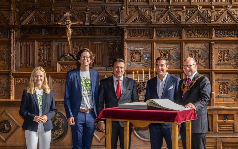 Mit einem Jahr Corona-Verzögerung haben der ehemalige Ministerpräsident von Griechenland, Alexis Tsipras (Foto 2.v.r) und der Regierungschef von Nordmazedonien, Zoran Zaev (3.v.r.) den Preis im LWL-Landesmuseum entgegengenommen. Zuvor hatten sich alle Preisträger im Friedenssaal in das Goldene Buch" der Stadt eingetragen. Zu den zahlreichen Ehrengästen des Events gehörten auch der NRW-Landtagspräsident André Kuper und Kölns Oberbürgermeisterin Henriette Reker. Den mit 100.000 Euro dotierten Preis vergibt die Wirtschaftliche Gesellschaft, ein Verbund aus Unternehmern in Westfalen und Lippe.