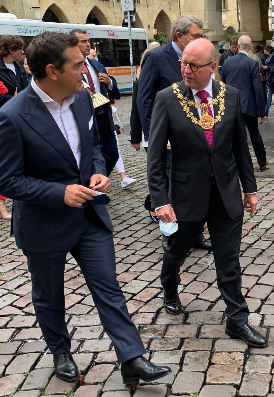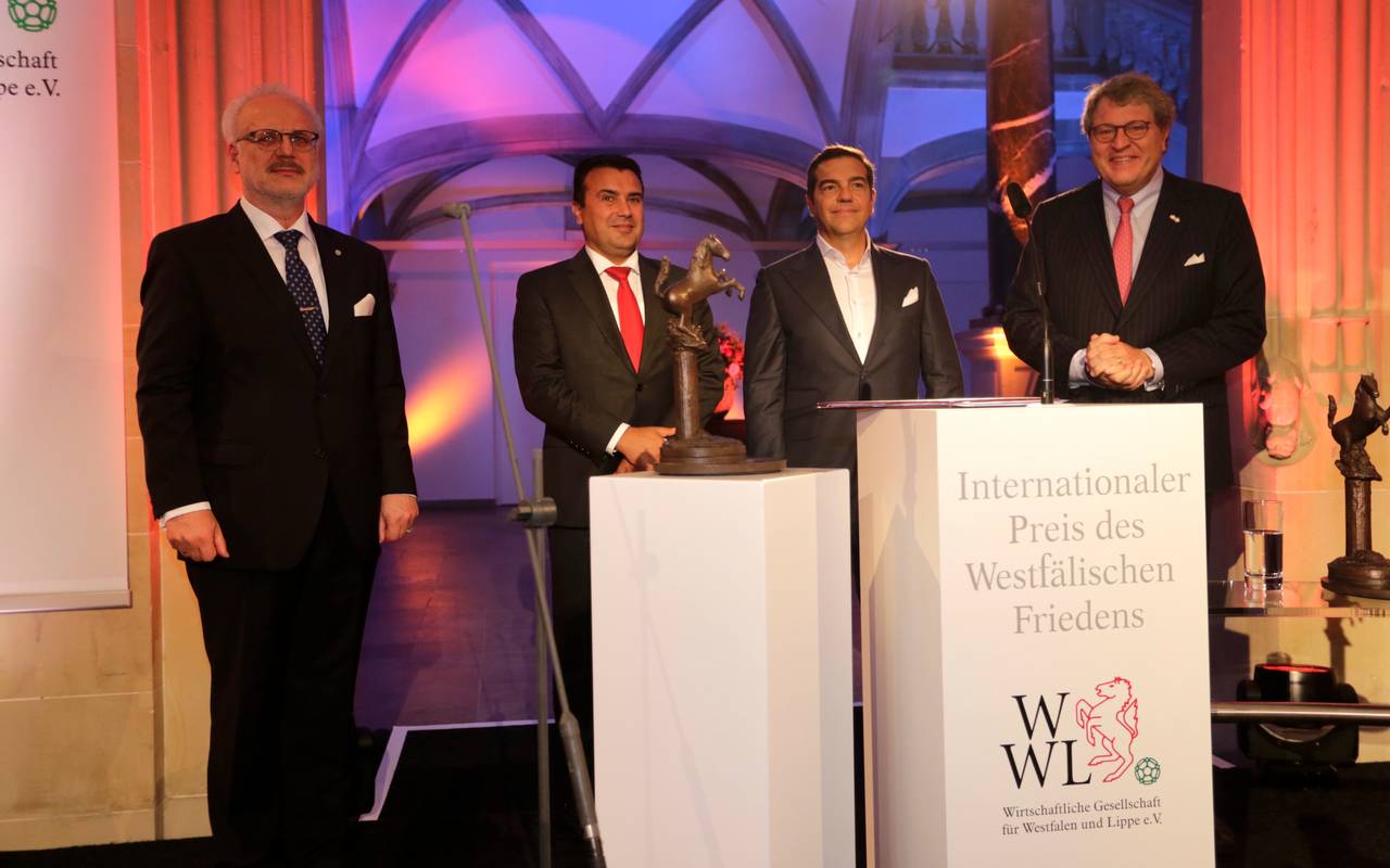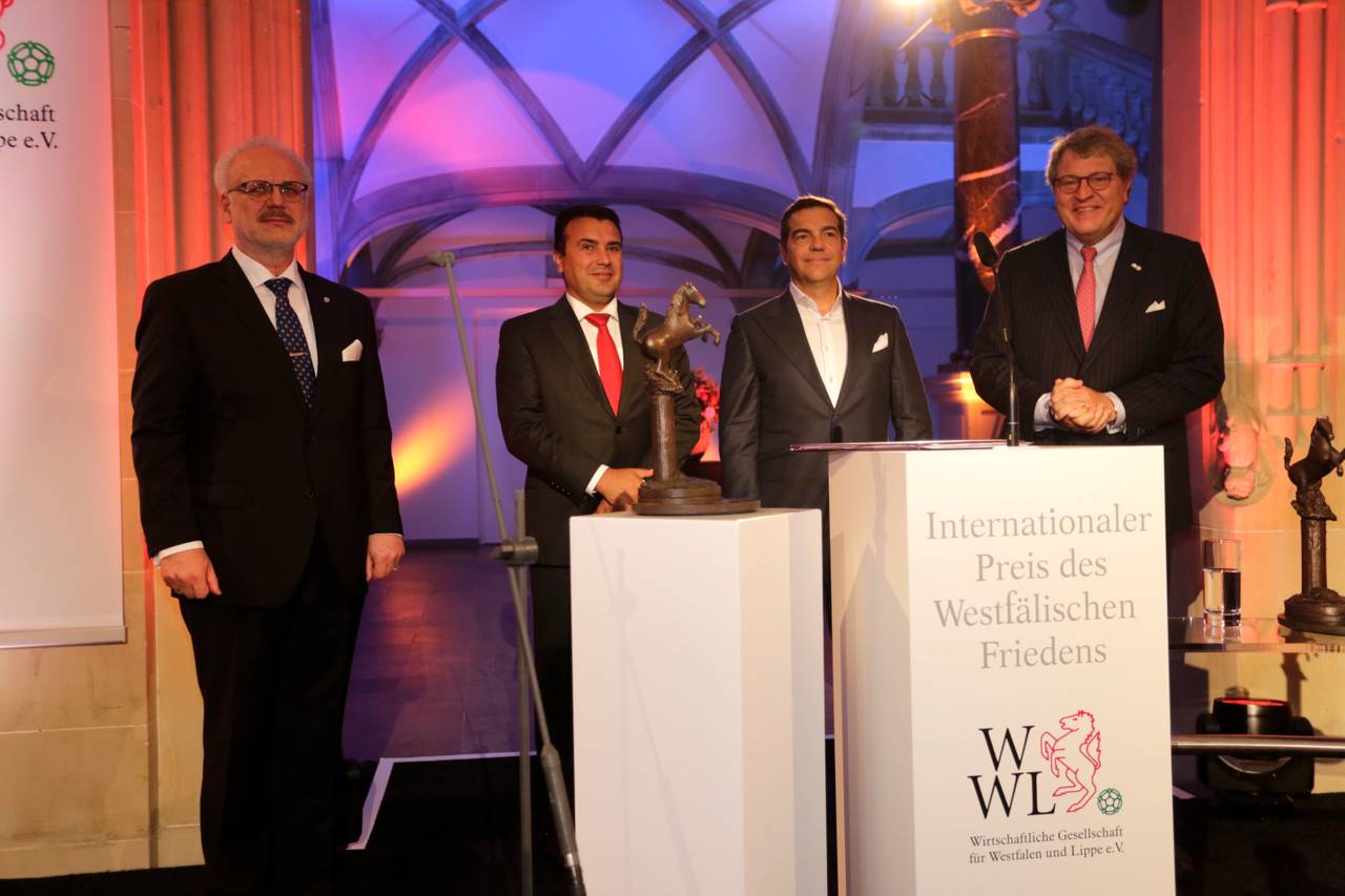 Tsipras und Zaev wurden für ihre Friedensbemühungen im Streit zwischen Nordmazedonien und Griechenland ausgezeichnet. Die Begründung der Wirtschaftlichen Gesellschaft: Die beiden hätten Hass und Nationalismus zu überwinden versucht und dabei ihre eigene politische Karriere aufs Spiel gesetzt. Beide wurden nach Beendigung des Streits Anfang 2019 abgewählt. Zaev im vergangenen Jahr aber wiedergewählt. Die Laudatio hielt der Präsident Lettlands, Egils Levits. Er repräsentiert einen der drei baltischen Staaten, die 2018 gemeinsam den Friedenspreis erhalten hatten. Levits kennt Münster und hielt seine Rede auf deutsch. Er besuchte in den 70er-Jahren das lettische Gymnasium in unserer Stadt.