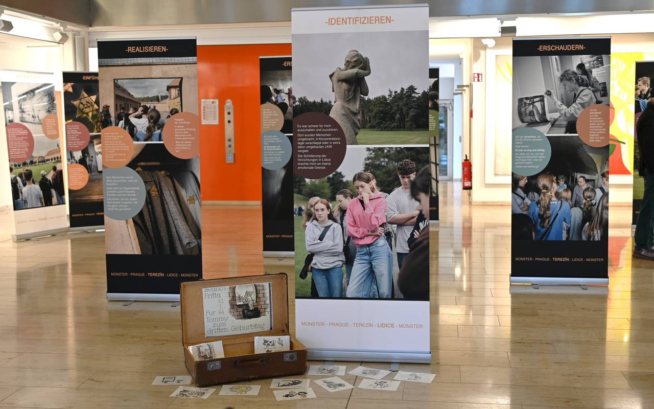 Auch am Annette-von-Droste-Hülshoff-Gymnasium haben sich die Schüler:innen mit dem Nationalsozialismus auseinandergesetzt. Sie haben eine Ausstellung mit dem Titel "Koffer packen für Tommy: Sich erinnern und nie vergessen" erarbeitet, die ab heute (27.01.) bis zum 14. Februar von der Bezirksregierung Münster gezeigt wird. Basis für dieses Projekt war ein Bilderbuch des in Auschwitz-Birkenau ermordeten Künstlers Bedrich Fritta für seinen Sohn. Es erzählt die Geschichte des kleinen Tommy, der als Einjähriger mit seinen Eltern aus Prag nach Theresienstadt deportiert wird, beide Eltern verliert und als Einziger der Familie überlebt. Gemeinsam mit Frittas Enkel, David Fritta Haas, reiste die Klasse nach Prag, Terezin und Lidice. Diese Gedenkstättenfahrt wurde fotografisch vom münsteraner Fotograf Andreas Löchte festgehalten. Diese Bilder sind nun Teil der Ausstellung. Die Ausstellung kann zu den regulären Öffnungszeiten der Bezirksregierung (Mo.-Do. 7.30-16.00 Uhr und Fr. 7.30-14.00 Uhr) besucht werden.