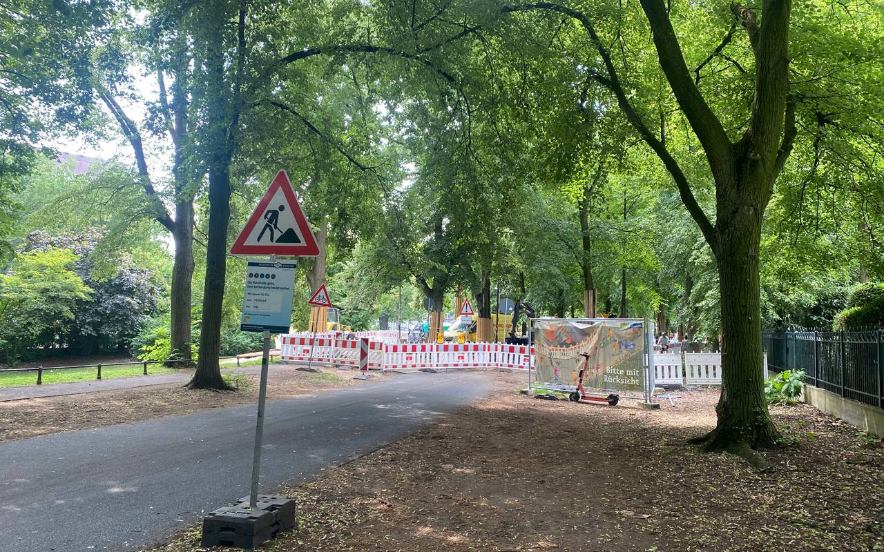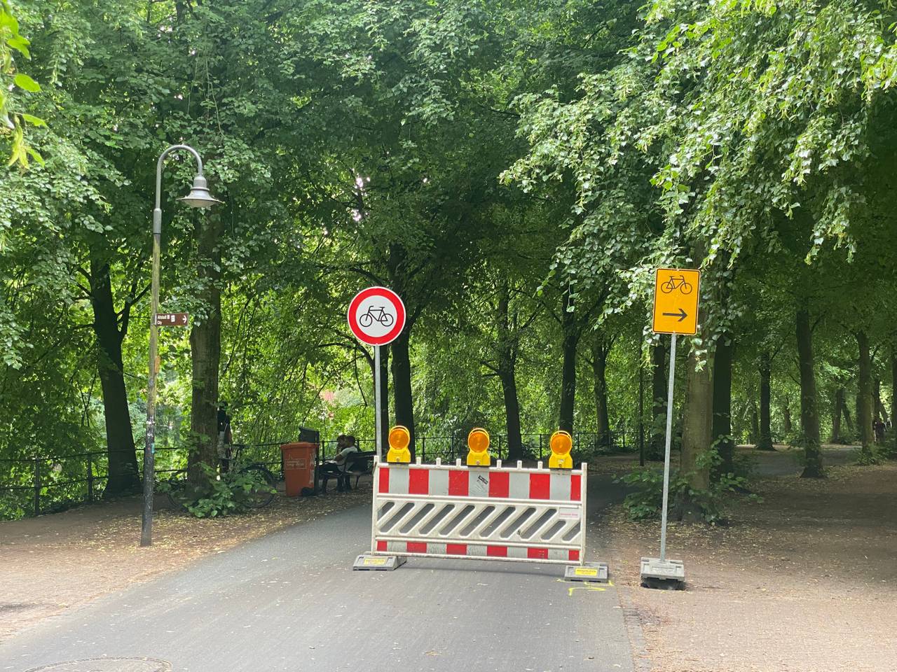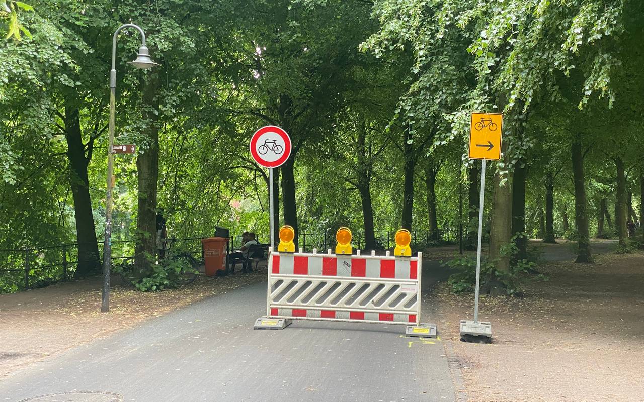 In Höhe Ludgerikreisel wird an der Promenade gebaut, für Fahrräder und Roller gibt es deswegen eine kurze Umfahrung, die auf verlegten Bodenplatten führt. Diese Platten waren nach dem Regen heute früh und durch matschige Blüten der Linden dort gefährlich rutschig geworden. Am Morgen und am Vormittag waren mehrere Radler:innen und Passanten dort gestürzt. Der Versuch, den Weg mit Hochdruckreinigern sauber zu bekommen, brachten wenig, es blieb weiter zu glatt und zu gefährlich. Für heute (20.6.) hat die Polizei den Bereich gesperrt. Aber daran halten sich längst nicht alle.