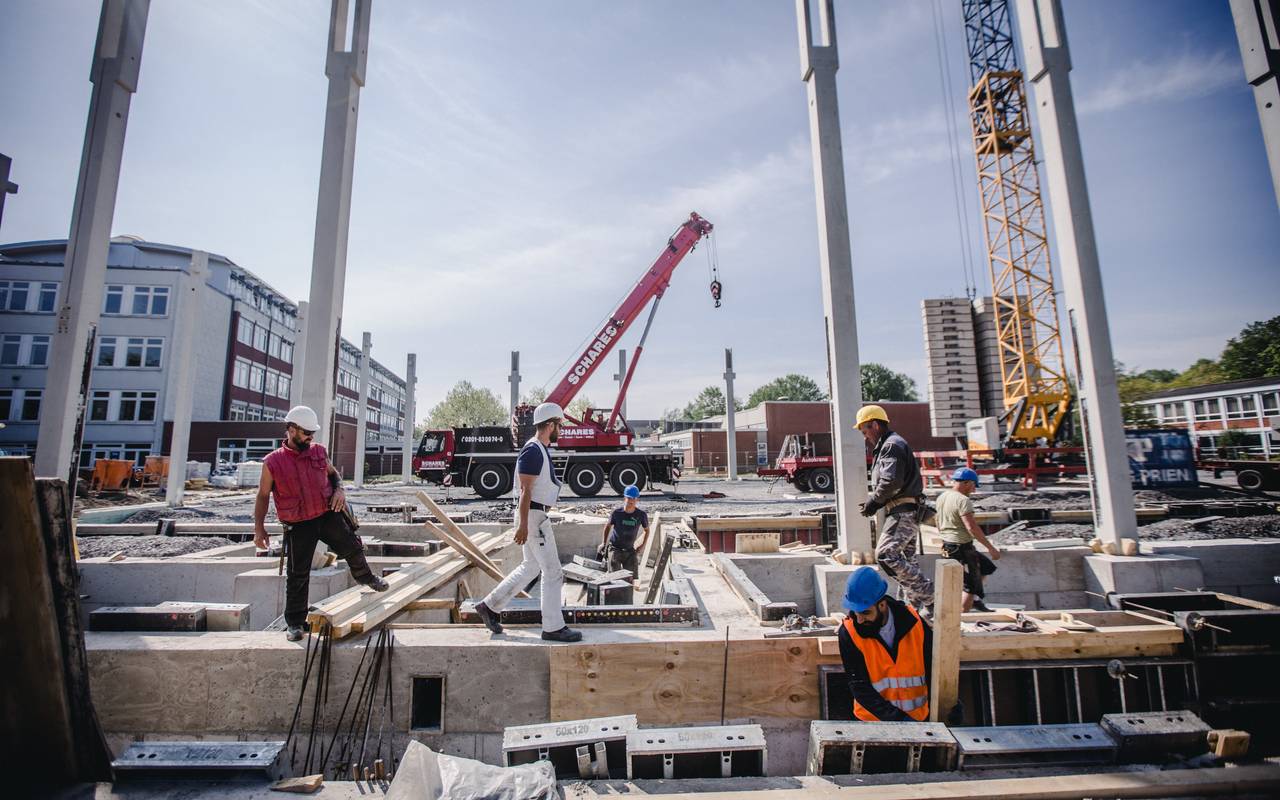 Drei Tonnen schwer und zehn Meter hoch: 31 Stützen - insgesamt über 90 Tonnen Stahlbeton - werden demnächst die Vierfachsporthalle an der Mathilde-Anneke-Gesamtschule tragen.