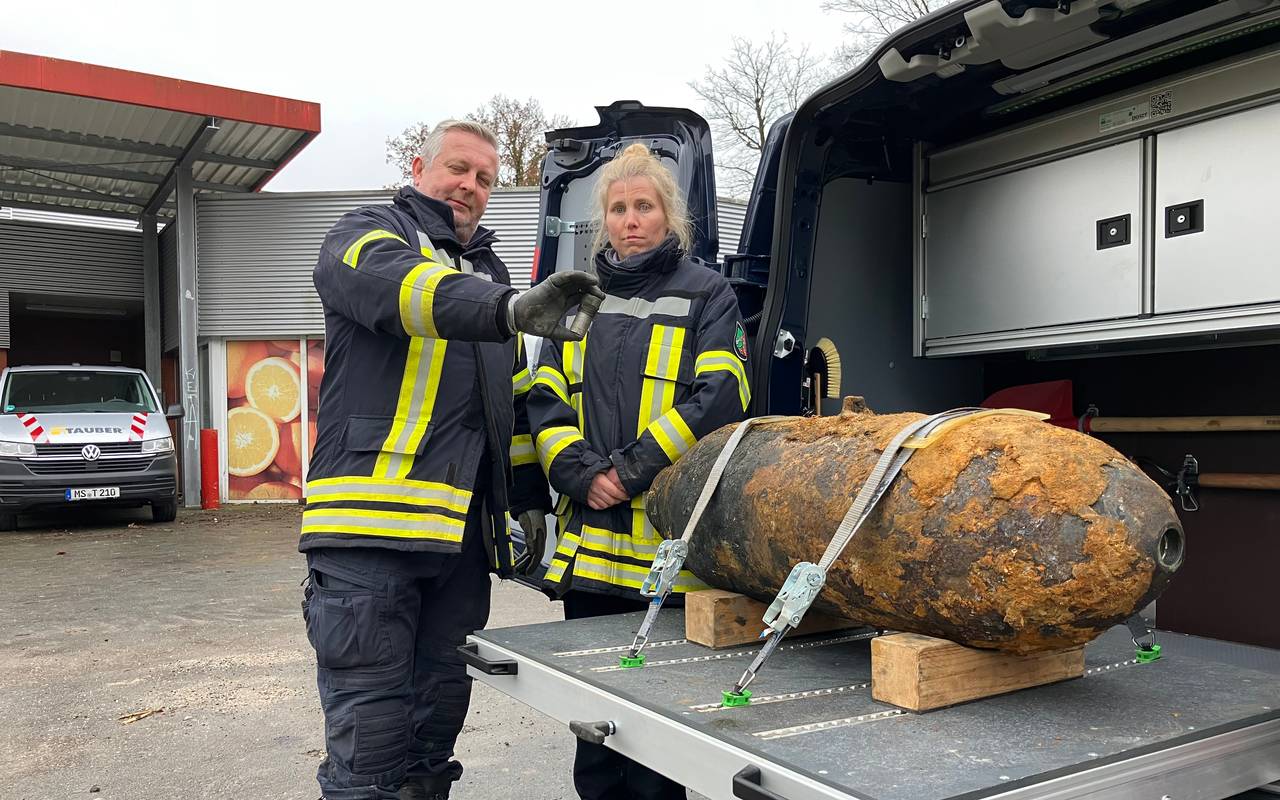 Peter Asmussen und Patricia Heyne vom Kampfmittelbeseitigungsdienst der Bezirksregierung Arnsberg präsentieren die Weltkriegsbombe.
