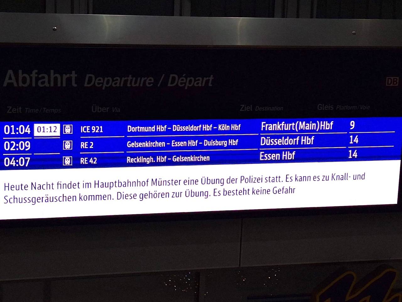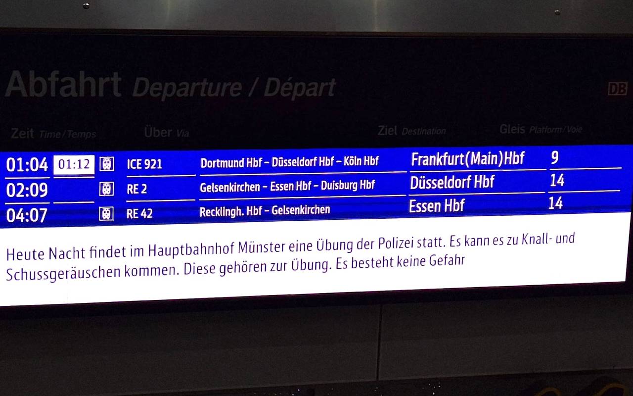 In den frühen Morgenstunden beendeten die Bundespolizei und die Polizei Münster ihre gemeinsame Großübung. Sie übten verschiedene Einsätze, auch lebensbedrohliche. Das Ganze sollte unter möglichst realistischen Bedingungen stattfinden, deshalb sollte vor der Übung auch nichts nach außen dringen. Rund 30 Einsatzkräfte von Landes- und Bundespolizei waren für die Übung im Einsatz, insgesamt beteiligten sich fast 300 Menschen. Zum Beispiel Menschen, die vorgaben verletzt zu sein. Wer in der Nähe des Hauptbahnhof unterwegs war, konnte Knallgeräusche und Schreie hören, auch Rauch war zu sehen. Solche Großübungen hat es bereits mehrfach an Bahnhöfen und Flughäfen in Deutschland gegeben.