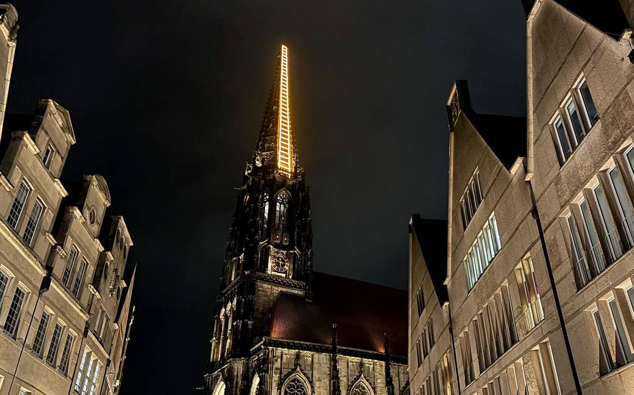 Die Höhenkletterer:innen haben ganze Arbeit geleistet. Die Himmelsleiter hängt wieder am Lamberti-Kirchturm. Um 17:00 Uhr wurde das Licht angeschaltet. Die Künstlerin Billi Thanner ist extra aus Wien angereist, um dabei zu sein.