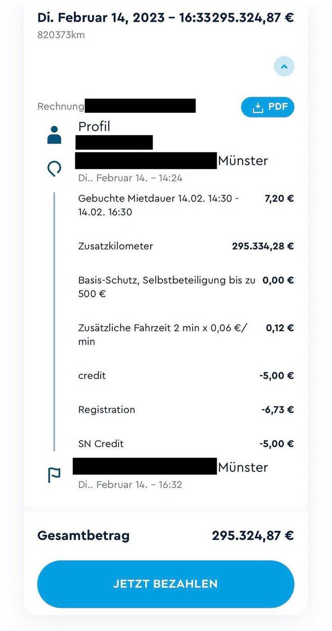 Ferhat sollte für die Spritztour exakt 295.324,87 Euro zahlen. Um den Betrag online zu begleichen, sollte er nur auf den Zahlungs-Button klicken. Gut, der Münsteraner hatte die gebuchte Mietdauer um zwei Minuten überschritten. Laut Carsharing-Anbieter ShareNow soll er in der gebuchten Zeit allerdings insgesamt unglaubliche 820.000 Kilometer gefahren sein. Nachgerechnet hätte Ferhat damit in zwei Stunden und zwei Minuten 20mal die Erde umrundet und wäre schneller unterwegs gewesen als eine Raumsonde der NASA. Zweifel kamen bei ShareNow trotzdem zunächst nicht auf. Laut Rechnung wurden pro Zusatzkilometer 39 Cent berechnet. Macht zusammen fast 300.000 Euro.