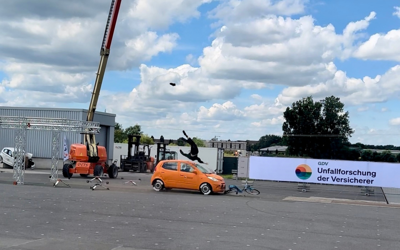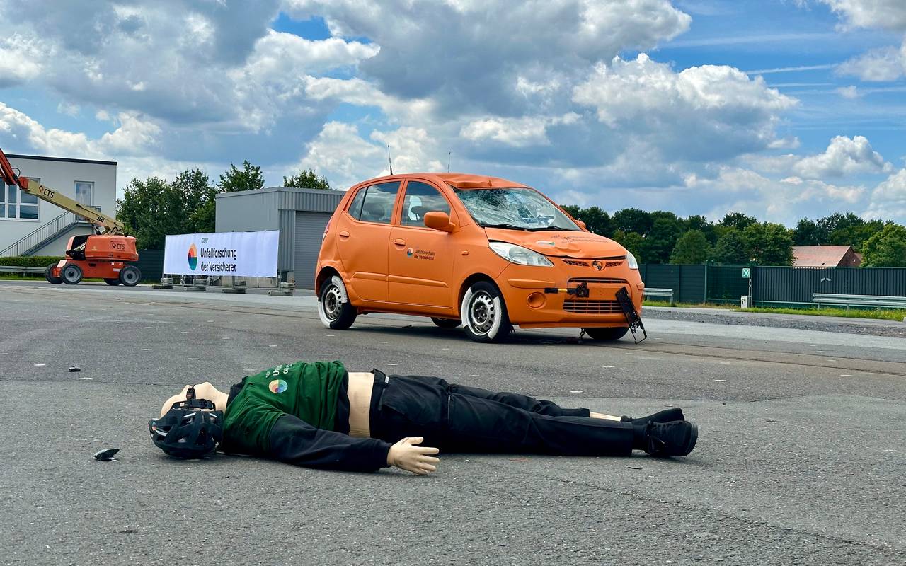 Der Test zeigt, welche schweren Folgen so ein Auffahrunfall haben kann. Der Radfahr-Dummy wurde durch den Aufprall mehrere Meter durch die Luft geschleudert, sein Rad flog sogar noch weiter. Überlebt hätte der Radfahrende diesen Unfall wohl kaum.