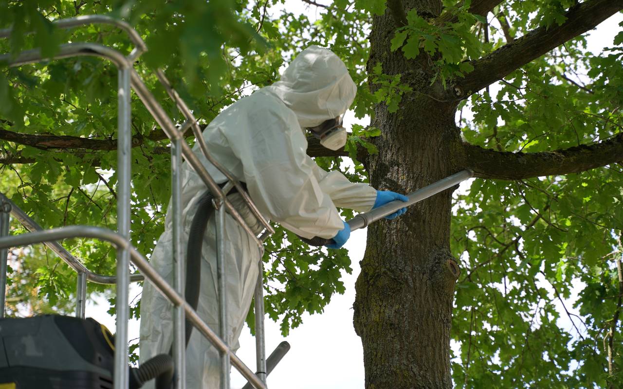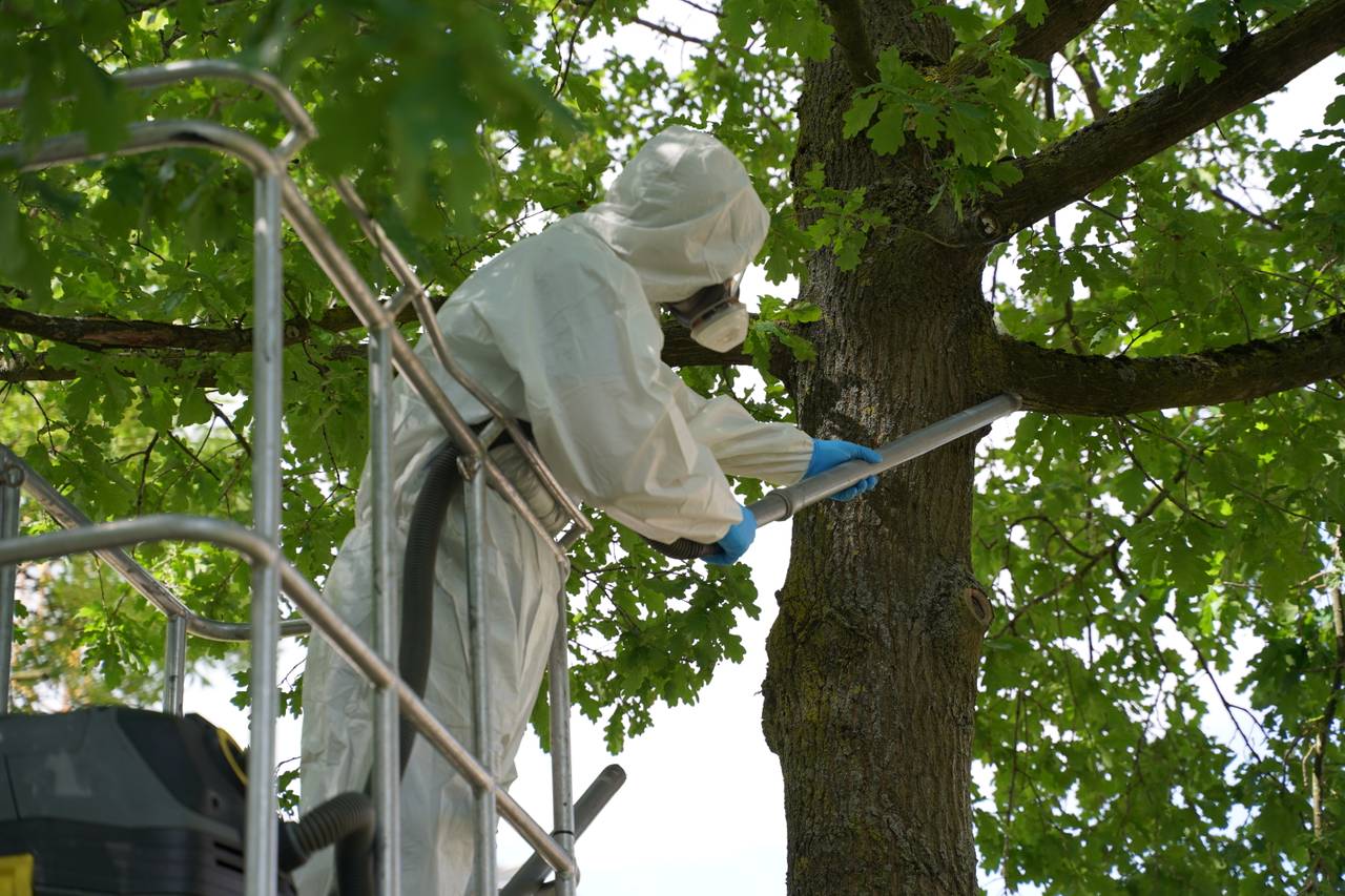 Schon im Mai hatte die Stadt eine Fach-Firma losgeschickt. Die hat insgesamt 8.000 Eichen im gesamten Stadtgebiet mit einem Raupen-Gift eingesprüht. Das hatte seinen Effekt: Die Eichenprozessionsspinner-Raupen, deren lange Brennhaare beim Menschen Atemnot, Ausschläge und allergische Schocks auslösen, befielen nur noch ganz vereinzelt Eichen in unserer Stadt. Von diesen saugten Mitarbeiter der Stadt die Raupen dann ab und brachten sie weg.