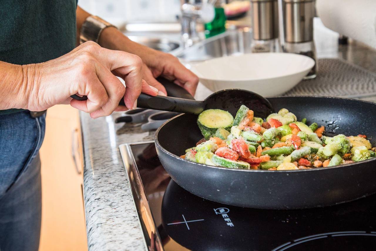 Oder wie wär's mit einer schnellen Gemüsepfanne? Dazu eignet sich eine TK-Gemüsemischung, mit der man sich ruhig beim Wocheneinkauf bevorraten kann. Sie wird einfach mit etwas Öl in der Pfanne gegart. Mit ein paar angebratenen Zwiebeln wird es pikanter. Wer mag, fügt weiteres Gemüse und passierte Tomaten hinzu, würzt das Ganze mit Pfeffer, Salz und einigen Kräutern - die gibt es getrocknet oder tiefgekühlt bereits fertig geschnitten.