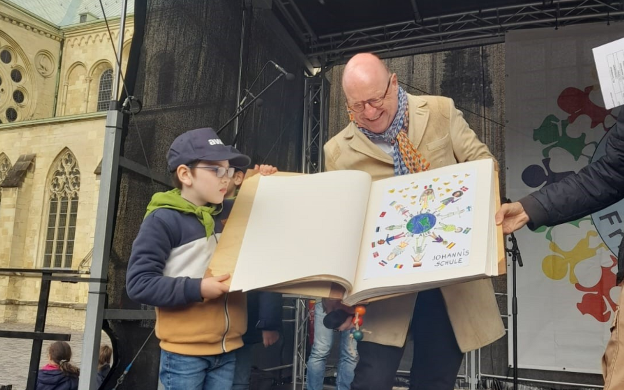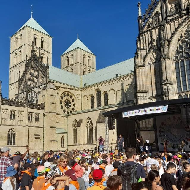 "Wir wollen Frieden für alle!" Das ist die Botschaft des 27. Kinder-Friedenstreffens. Rund 1.800 Schülerinnen und Schüler versammelten sich von 10:00 bis 11:30 Uhr in der Stadt. Vorher sind die Kinder sternförmig durch die Innenstadt zum Domplatz gezogen. Dort angekommen wurden unter anderem Friedenslieder gesungen, der Domplatz wurde mit dem Wort "Frieden" in verschiedenen Sprachen bemalt und Kinder haben ihre Friedenswünsche in ihren jeweiligen Muttersprachen vorgetragen.