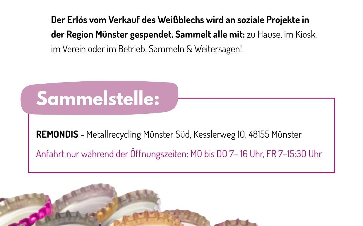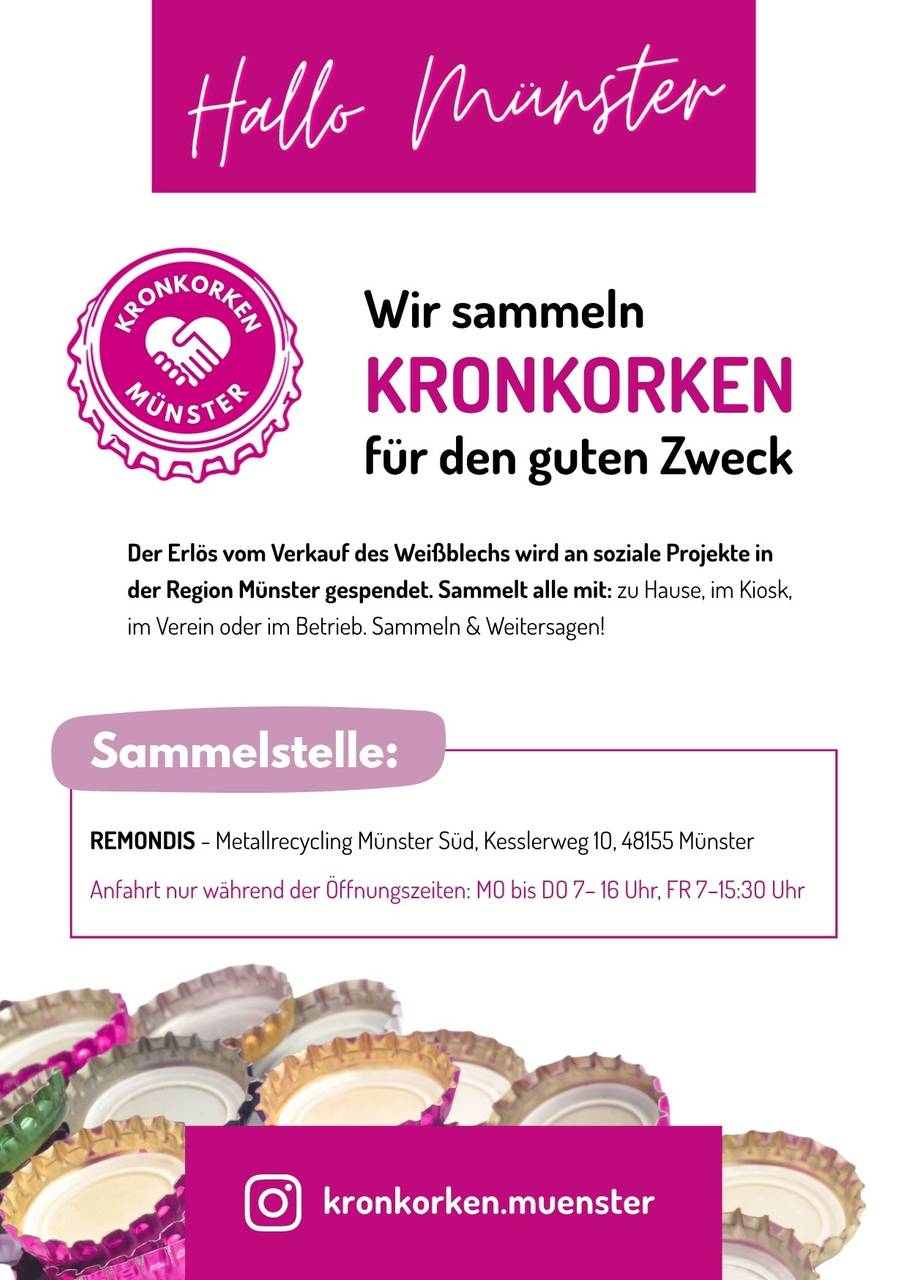 Beim Müllwandern findet Klara natürlich auch immer mal wieder Kronkorken. Besonders im Sommer liegen sie z.B. in Parks, am Kanal oder am Aasee. Daraus möchte Klara jetzt etwas Gutes machen: Sie schmeißt Kronkorken nicht mehr weg, sondern sammelt sie. Auf dem Gelände der Firma Remondis steht jetzt auch ein eigener Container nur für Kronkorken. Wenn der voll ist, werden sie gegen Geld aufgewogen. Klara möchte damit soziale Projekte in Münster unterstützen. Wegen des geringen Eigengewichts braucht es natürlich sehr viele Kronkorken, damit auch ordentlich Geld für den guten Zweck zusammenkommt. Und da kommt ihr ins Spiel. Ob in der Schule, im Verein oder der Kneipe: Sammelt gerne mit und beteiligt euch an der Aktion.