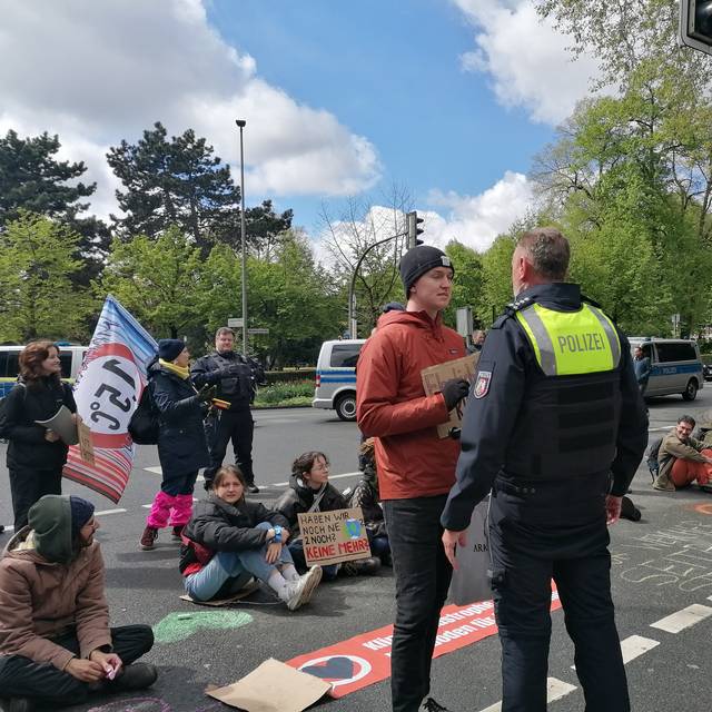 Die Aktivist:innen waren heute früh (31.03.) immer wieder dabei, auf die Straße zu laufen und Autos zum Stehen zu bringen. Auf der Von-Vincke-Straße klebten sich zwei Aktivist:innen fest, ein dritter Aktivist:in scheiterte, weil die Polizist:innen schnell vor Ort waren. Dadurch wurde der Berufsverkehr etwa zehn Minuten lang leicht behindert. Nachdem die Polizist:innen die Aktivist:innen von der Straße holten, überprüften sie ihre Personalien. Sie müssen mit einer Anzeige rechnen. Zwei der Aktivist:innen wurden in Gewahrsam genommen, da sie sich weigerten heute keine weiteren Aktionen durchzuführen.