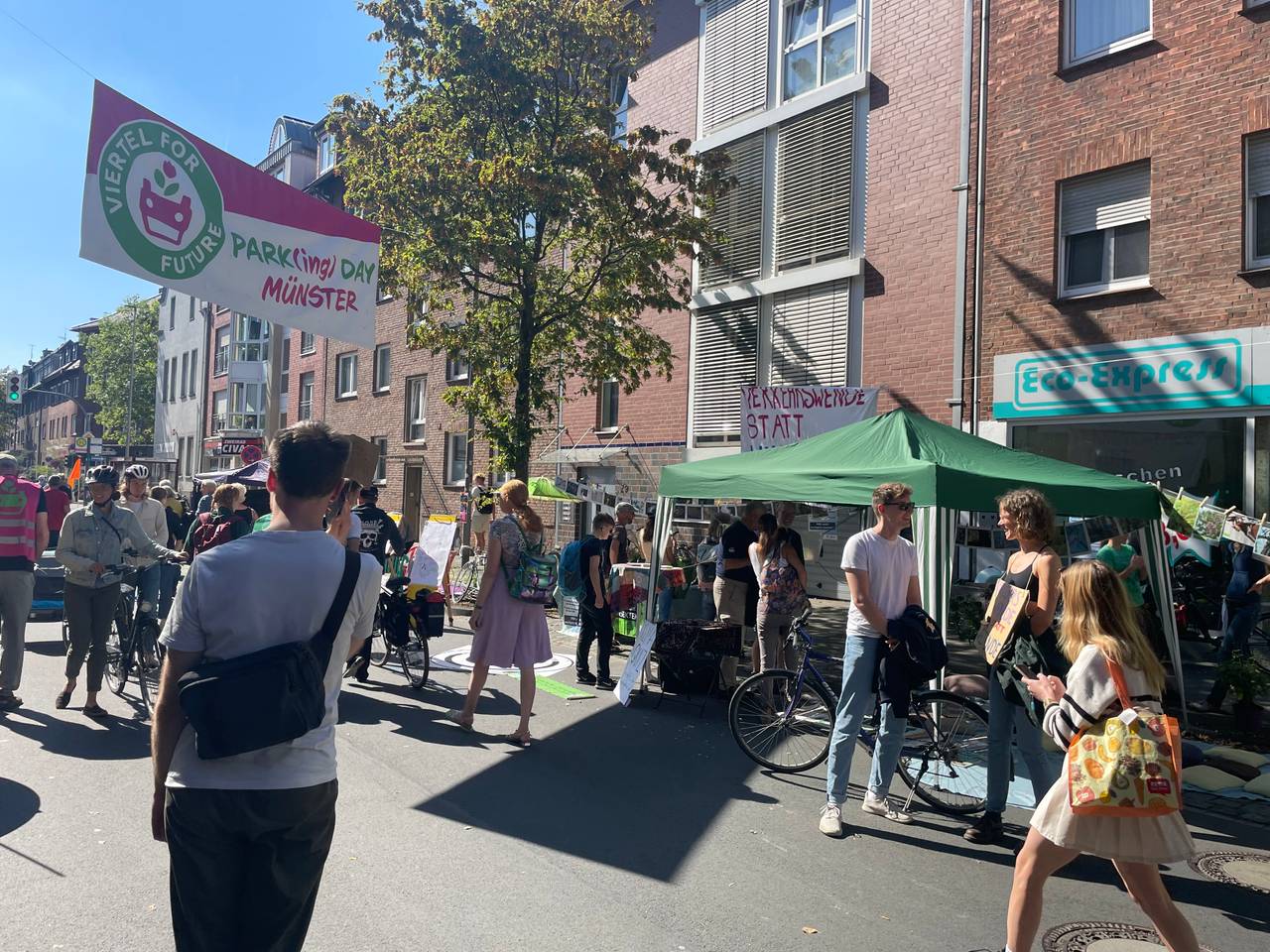 Beim "Park(ing) Day" in Münster setzen sich rund 70 Umweltinitiativen, soziale und kulturelle Gruppen für eine autofreie Innenstadt ein. Neben Diskussionsrunden auf der Bühne und an den Ständen, Spielangeboten wie Seifenblasen und das Bedrucken von T-Shirts, gibt es auch eine musikalische Begleitung. Aus diesem Grund sind die Parkplätze und die Fahrbahn in der Kanalstraße ausgehend vom Cheruskerring bis hin zum Westfalenfleiß-Parkplatz gesperrt. Voraussichtlich um 20 Uhr wird die Strecke wieder freigegeben.