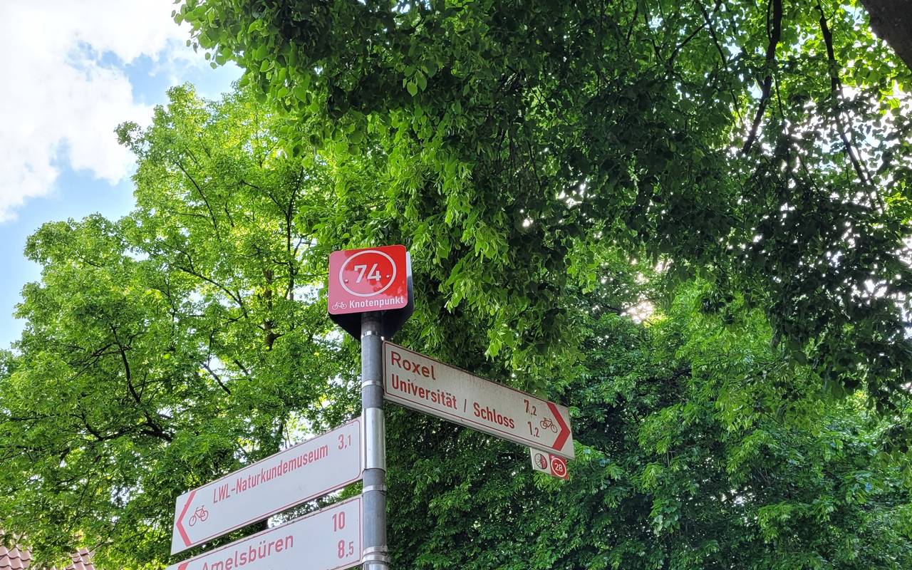 Sie sind auch neben den Logos der Themenrouten an Kreuzungen zu finden. Tourenradler:innen ermöglichen sie eine rasche Orientierung - ganz ohne Ortskenntnis. Über die Zwischenwegweiser mit den kleinen roten Pfeilen gelangen sie zum nächsten Netzknoten. Das Knotenpunktsystem können Radfahrende jetzt im gesamten Stadtgebiet von Münster nutzen - und darüber hinaus. Denn es verknüpft Stadt, Region und Land.