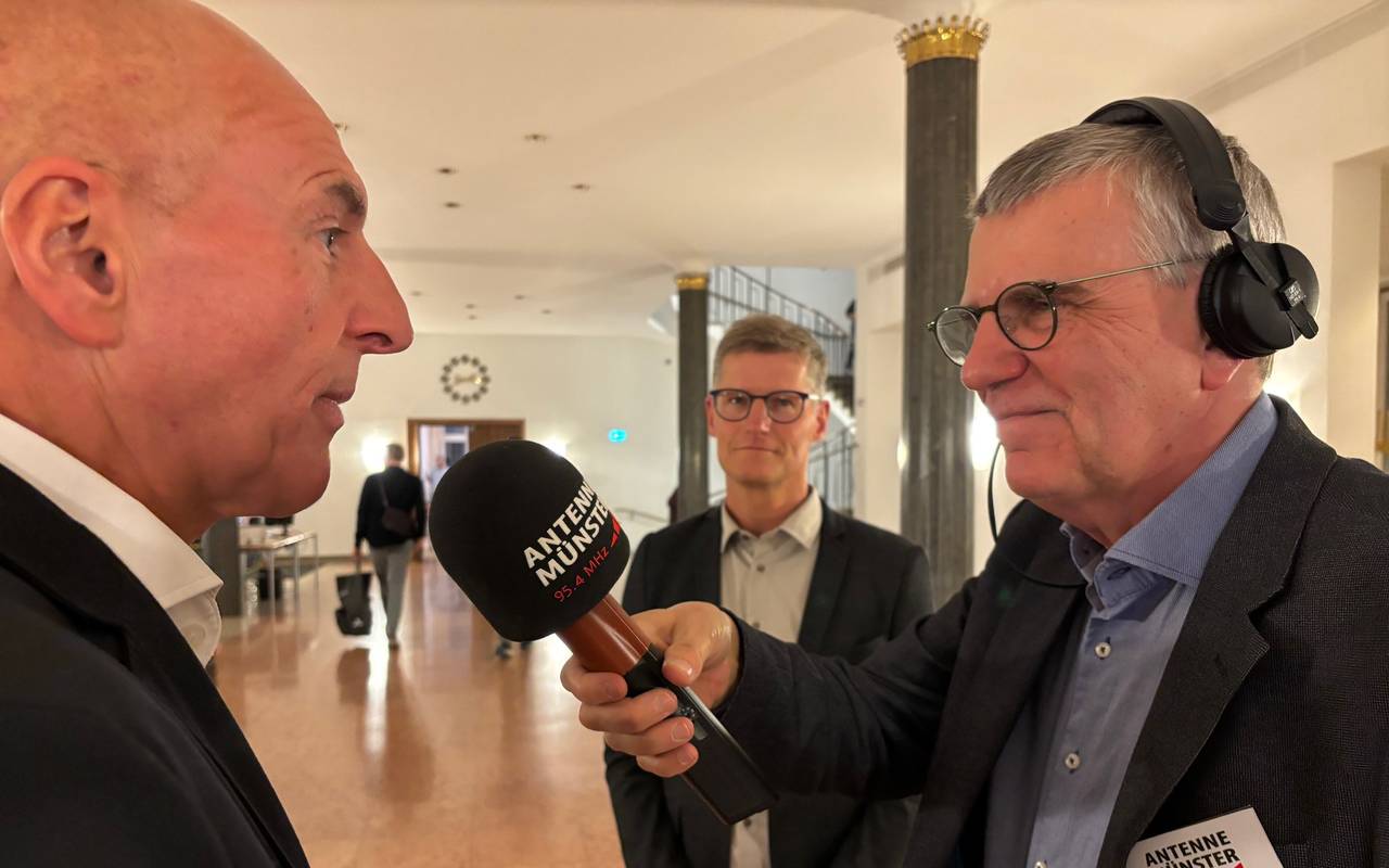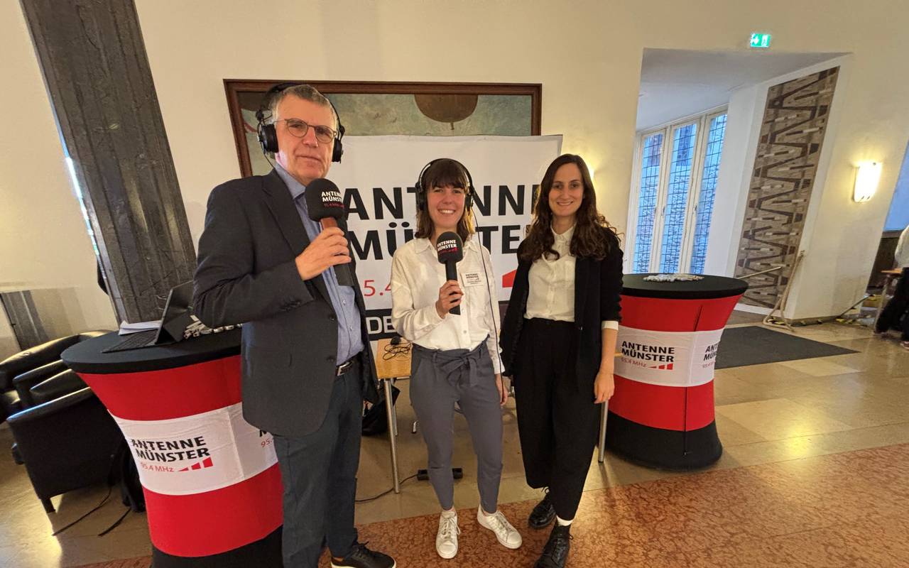 Wir senden live aus unserem ANTENNE MÜNSTER-Wahlstudio direkt aus der Bürgerhalle im Rathaus. Unsere Reporterinnen Christina Strunck (M.) und Lena Zils (r.) sowie Chefreporter Matthias Menne (l.) halten euch laufend auf dem Stand, präsentieren Zwischenstände und sprechen mit den Spitzenkandidaten vor Ort.