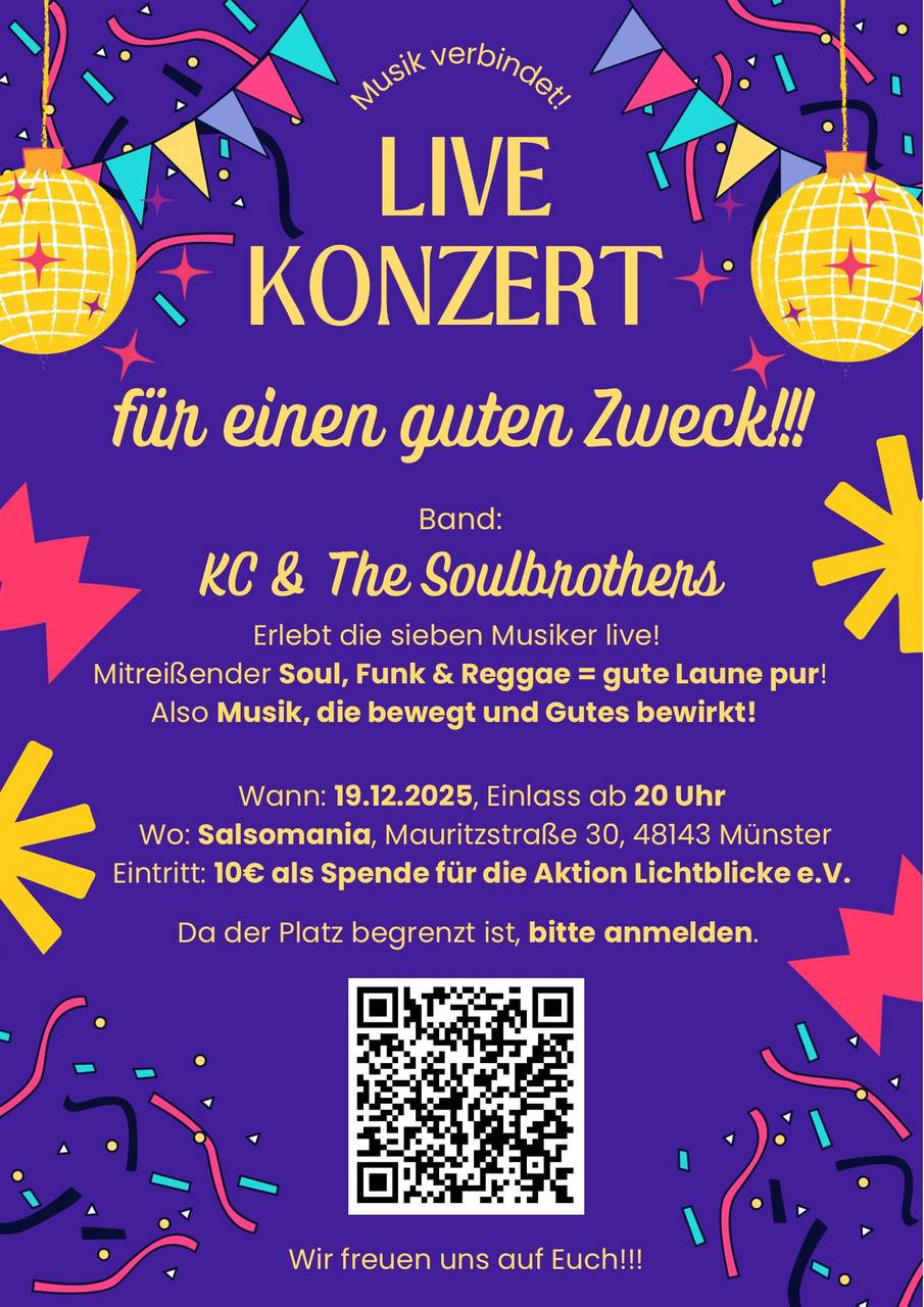 Wenn "KC & The Soulbrothers" auftreten, ist gute Laune garantiert. Mit ihrer Mischung aus Funk, Soul und Reggae bringen sie das Publikum zum Feiern. Der Eintritt kostet 10 Euro pro Person, wobei das Geld direkt an unsere Aktion Lichtblicke gespendet wird. Damit helfen wir benachteiligten Kindern und Familien in NRW. Da der Platz im Salsomania begrenzt ist, meldet euch gerne über den QR-Code auf dem Flyer (siehe unten) an.