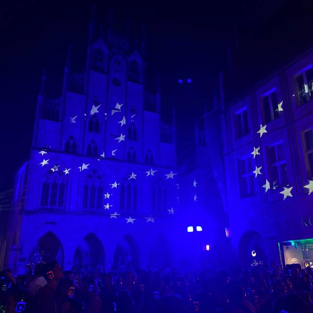 Am Freitag, 7. Juni, kehrt die Kopfhörerparty auf den Prinzipalmarkt zurück und lässt unter dem Motto "Celebrate Democracy" zwei Tage vor der Europawahl die Demokratie hochleben. Mit Einbruch der Dunkelheit zeigen Illuminationen den europäischen Sternenhimmel auf der blau erleuchteten Fassade des Historischen Rathauses. Vor Münsters Kulturerbestätte startet auf einem Dancefloor mit blauem Teppich und überspannt von einem transparenten Dach mit Lichttechnik um 20 Uhr die Party. Der Eintritt ist frei, der Zugang ist nur mit Kopfhörern möglich. Die Veranstaltung endet um 2 Uhr.