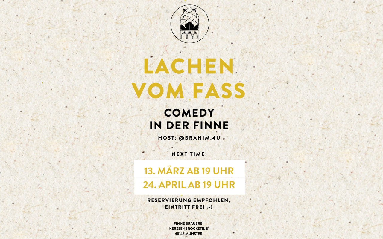 In der Finne Brauerei steht nicht immer nur das Bierbrauen im Mittelpunkt. Am Donnerstag (13.03.) treten in der Brauerei an der Kerßenbrockstraße 8 verschiedene Newcomer-Comedians aus der Region auf, moderiert wird der Abend vom Münsteraner Comedian Ibrahim alias @brahim.4u. Dazu könnt ihr euch an der hauseigenen Bar natürlich mit dem Bio-Bier und vielen weiteren Getränken der Finne Brauerei versorgen. Los geht's bei "Lachen vom Fass" um 19 Uhr, der Eintritt ist frei. Weitere Infos erhaltet ihr hier.