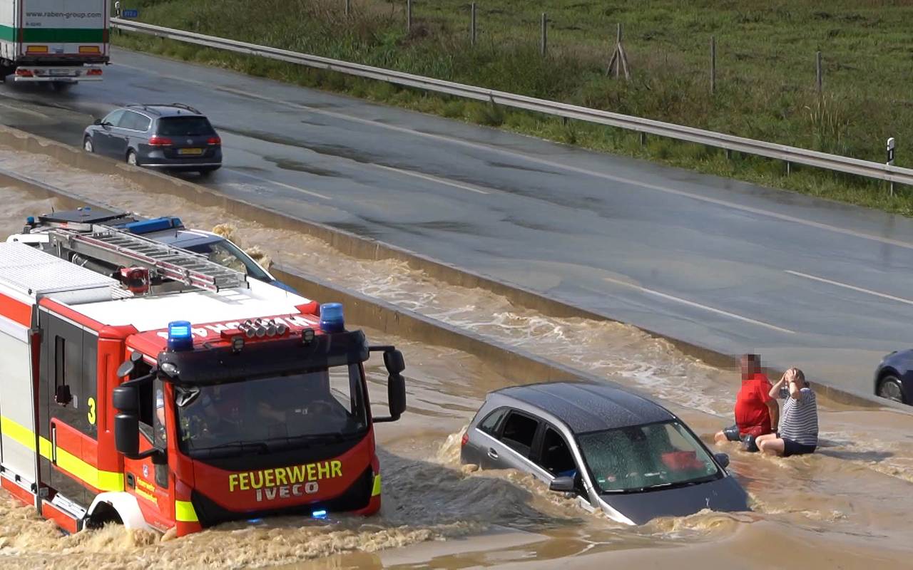 Die Feuerwehr hat in mehr als 300 Fällen im gesamten Kreisgebiet ausrücken müssen. Dabei ging es um Abpumpen von Kellern und Straßenteilen sowie um die Sicherung von übergetretenen Bach- und Flussläufen. Drei Blitzeinschläge führten dazu, dass zwei Scheunen und ein Strommast beschädigt wurden. Personen wurden hierbei nicht verletzt.