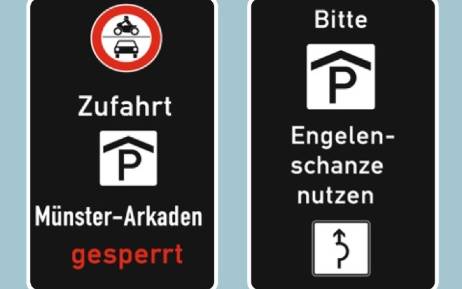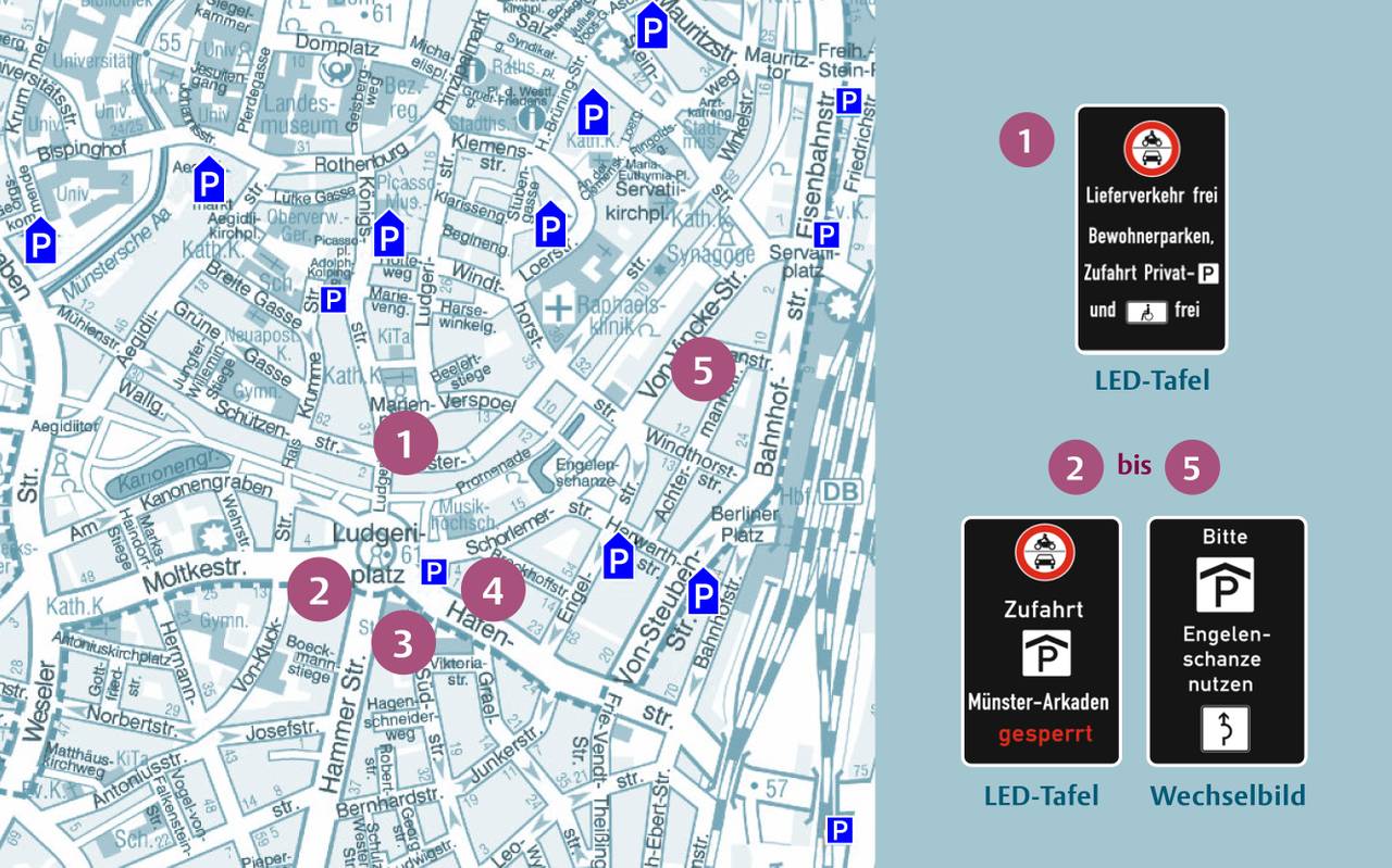 Neben einer LED-Tafel am Marienplatz informieren vier weitere LED-Tafeln an den Zufahrten in den Kreisverkehr Ludgeriplatz frühzeitig über eine mögliche Sperrung zum Arkaden-Parkhaus. Diese stehen in der Moltkestraße, der Hammer Straße und der Hafenstraße, wo die bereits vorhandenen Hinweise auf die Auslastung des Arkaden-Parkhauses ergänzt werden. Auf dem Weg vom Servatiiplatz zum Ludgeriplatz erfolgt der Hinweis bereits an der Von-Vincke-Straße - zwischen Urbanstraße und Windthorststraße.