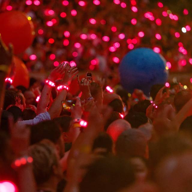 Die an den Eingängen verteilten LED-Armbänder aus recyceltem Plastik, mit denen jeder Besucher bei Coldplay schon seit Jahren Teil der farbenfrohen Lichtshow wird, tauchten die ausverkaufte Arena in kunterbuntes Licht. Auch an Konfetti und Feuerwerkeffekten mangelte es nicht.