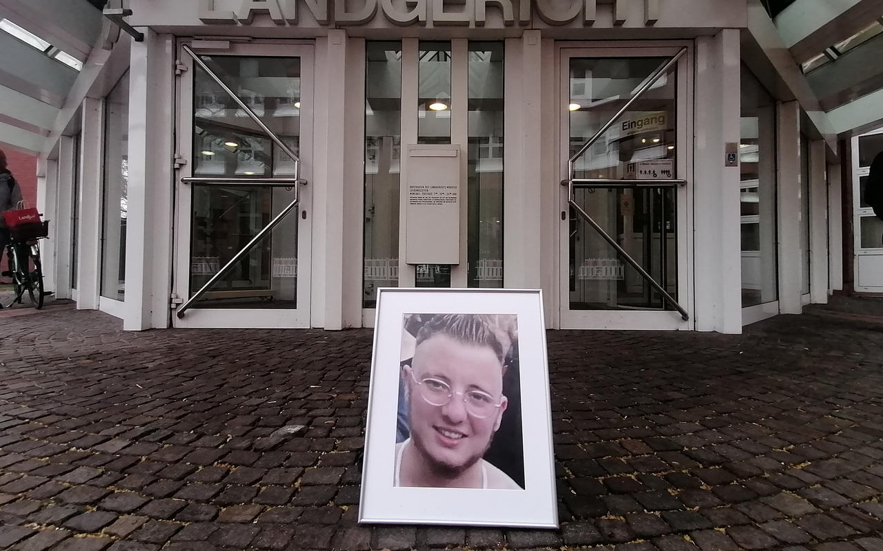 Morgen (Mittwoch, 22. März) fällt das Urteil im Fall 'Malte C.' - heute gab es am Landgericht Münster die Plädoyers. Einer der Zuschauer wollte, dass der trans-Mann Malte C. quasi mit im Gerichtssaal sitzt und hatte deshalb ein großes, gerahmtes Bild des Opfers mitgebracht und es auf einen Stuhl gestellt. Das Bild musste dann doch raus, entschied die zuständige Richterin. Somit stand es dann während des Prozesstages vor dem Landgerichtsgebäude direkt am Eingang (siehe Foto).