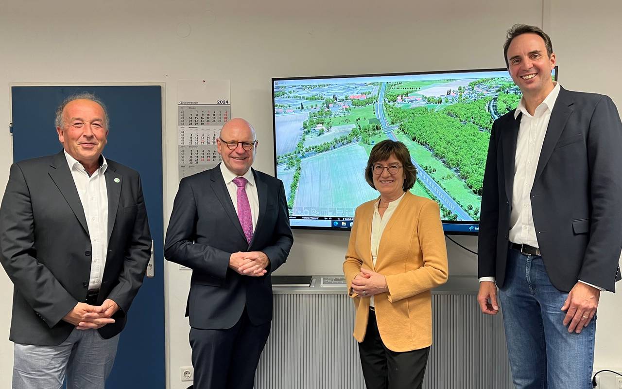 Dafür konnte es sich auch Oberbürgermeister Markus Lewe (2.v.l.) nicht nehmen lassen, persönlich im Baubüro der Umgehungsstraße Münster vorbeizuschauen. Dr. Petra Beckefeld, die technische Direktorin von Straßen.NRW, hatte Neuigkeiten zum letzten Bau-Abschnitt der Umgebungsstraße in Richtung Schifffahrter Damm parat: Der Ausbau der Umgehungsstraße im Nordosten Münsters geht bald in die finale Phase.
