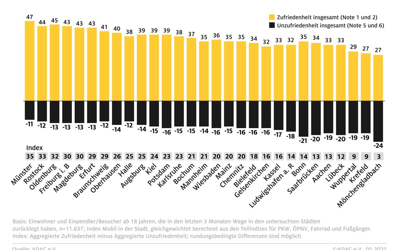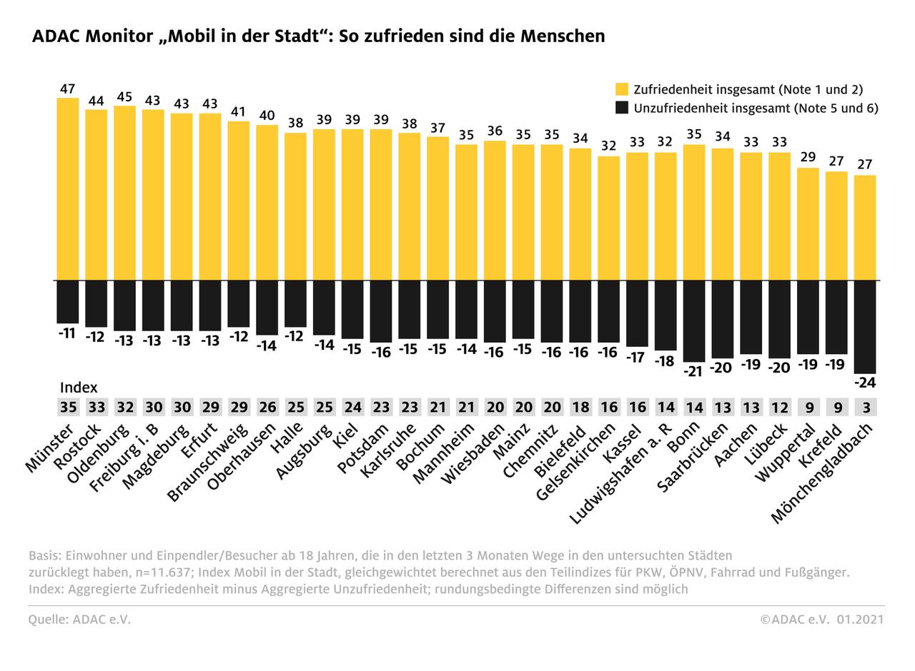 Platz 1 in der Gesamtwertung. Münster kann sich nach einer Befragung des ADAC über diese Auszeichnung im Vergleich zu 28 weiteren Großstädten mit maximal 500.000 Einwohnern freuen. Erhoben wurde die subjektive Zufriedenheit mit der Mobilität von Einwohner/-innen wie auch von Pendelnden. Gefragt wurde nach der Nutzung von PKW, dem ÖPNV, dem Rad und den Wegen, die zu Fuß zurückgelegt werden. In drei von vier Einzelkategorien hat Münster den ersten Platz belegt.