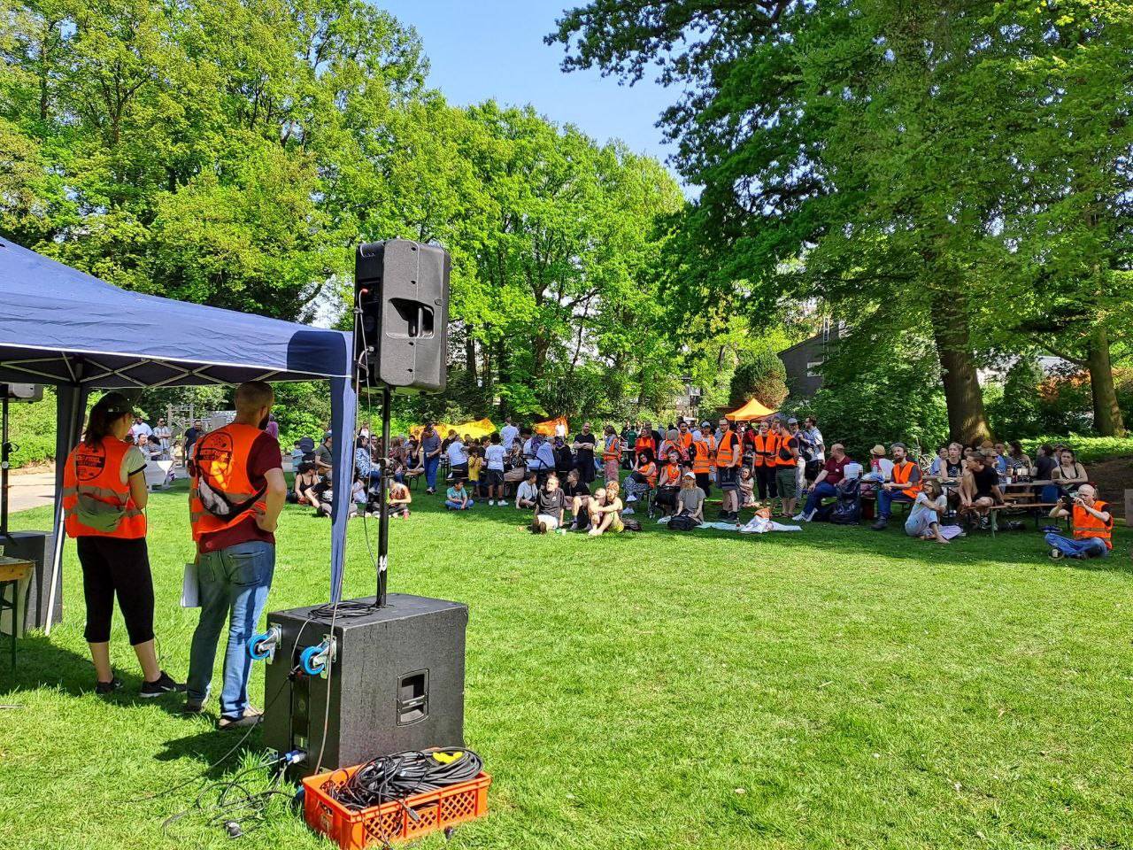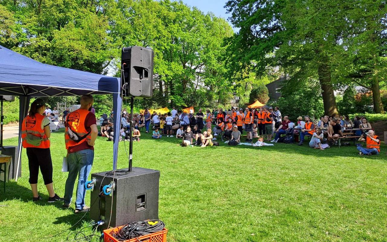 Zum dritten Mal hat die Stadtteilgewerkschaft "Berg Fidel Solidarisch" zum 1. Mai zu einem nachbarschaftlichen und kämpferischen Fest im zentralen Park in Berg Fidel eingeladen. Mit 300 Gästen war das Fest sehr gut besucht. Für das leibliche Wohl sorgten ein großes Buffet an von Nachbarn mitgebrachten Speisen, Getränke und die "Küche für alle"-Kochgruppe. Die politische Seite des Feiertags wurde in Reden unterstrichen, bei denen sich die verschiedenen Arbeitsgruppen von Berg Fidel Solidarisch vorstellten und von ihrer Arbeit berichteten.