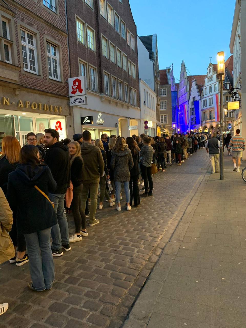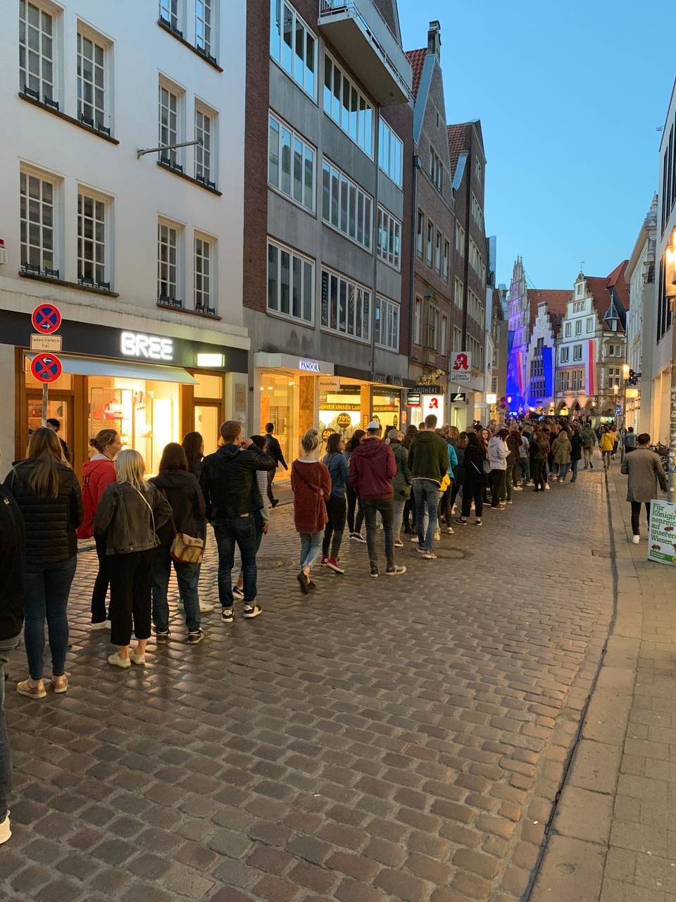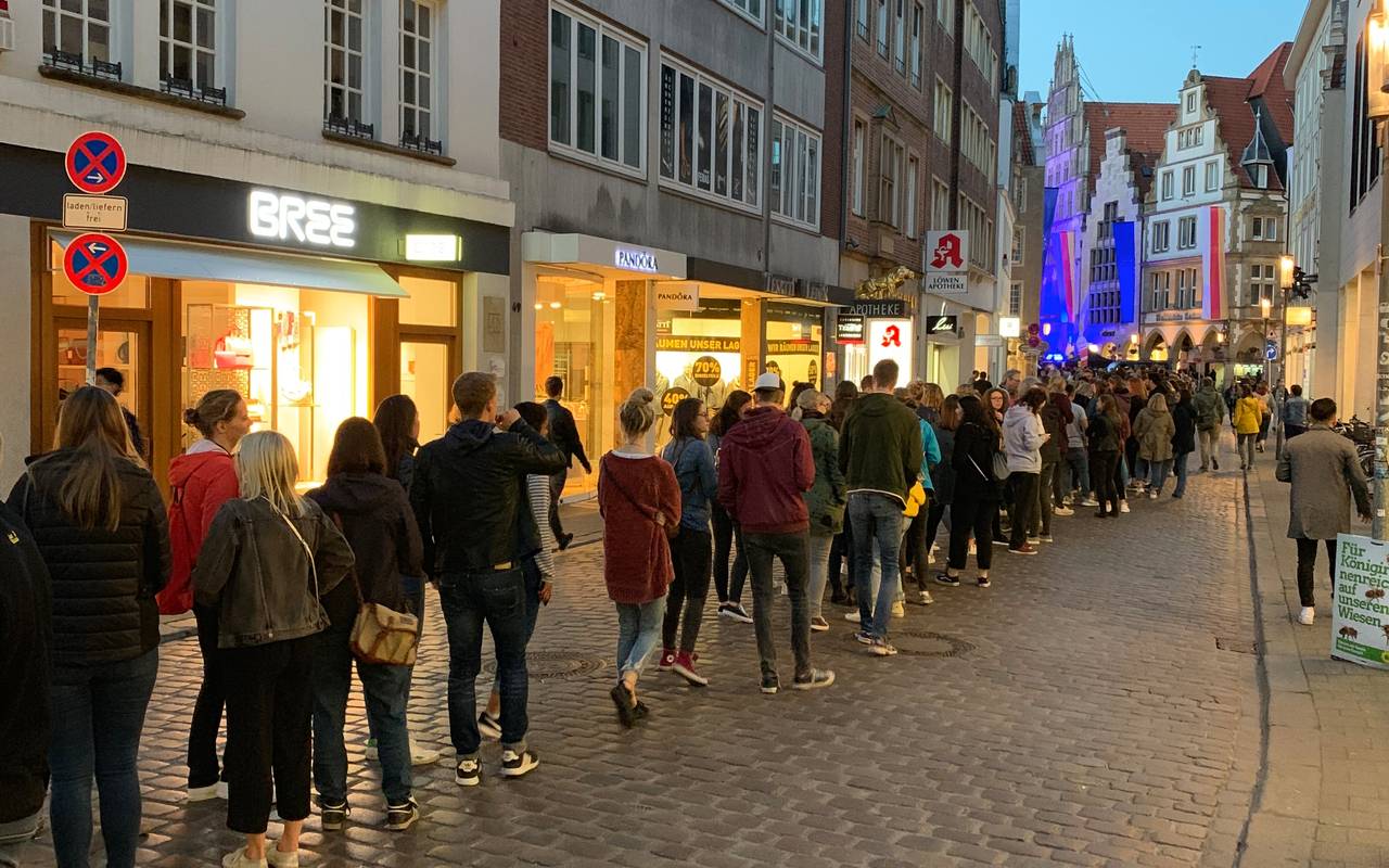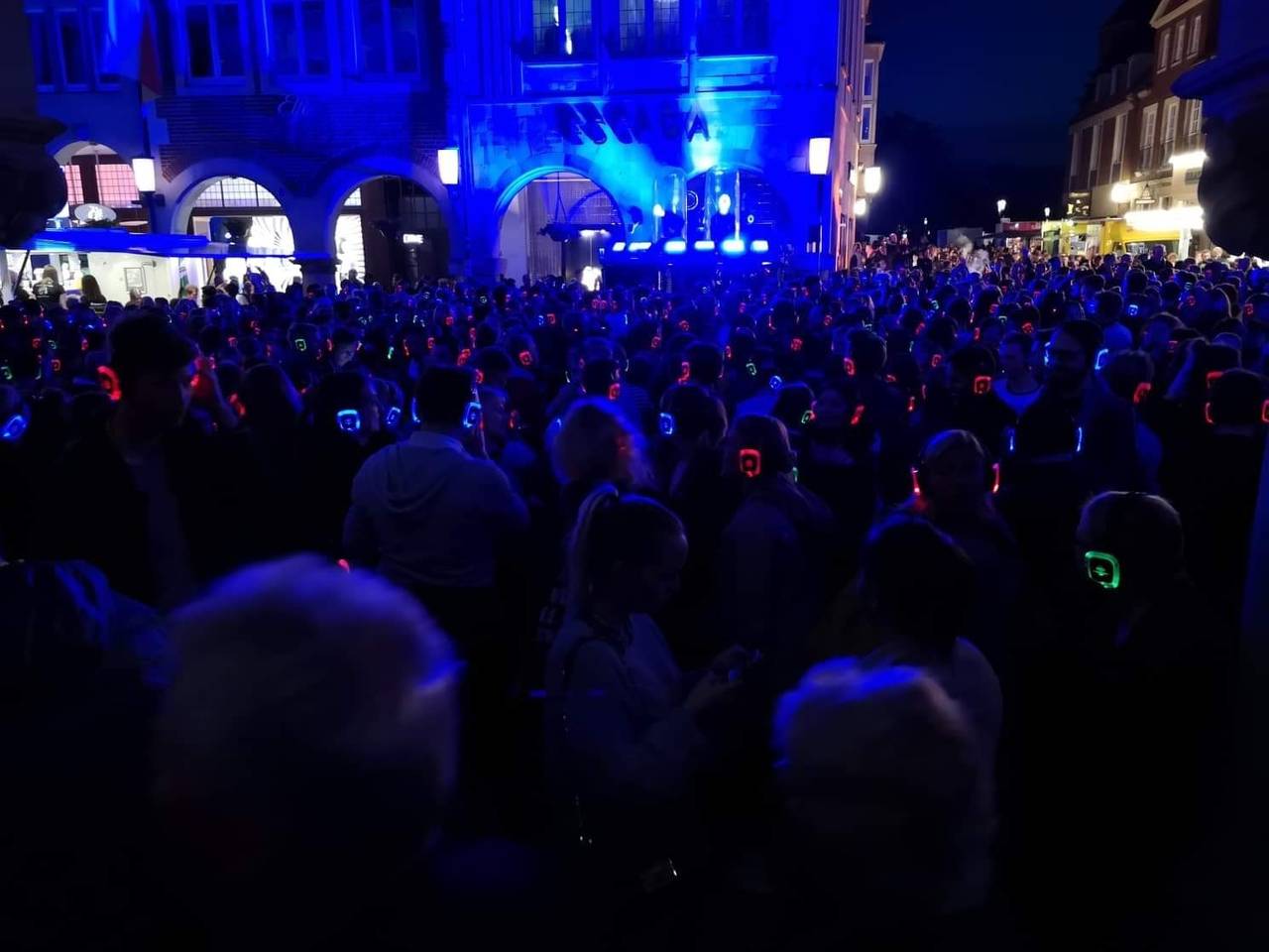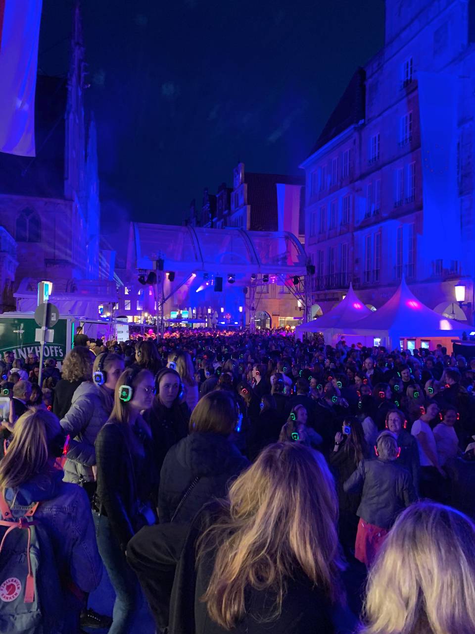 Bereits direkt zu Beginn der Kopfhörerparty um 21 Uhr war der Prinzipalmarkt proppevoll. Viele waren früh gekommen, um einen der begehrten Kopfhörer zu bekommen. Knapp 5.000 Kopfhörer standen zur Verfügung, es bildeten sich megalange Schlangen vor den Ausgabestellen.