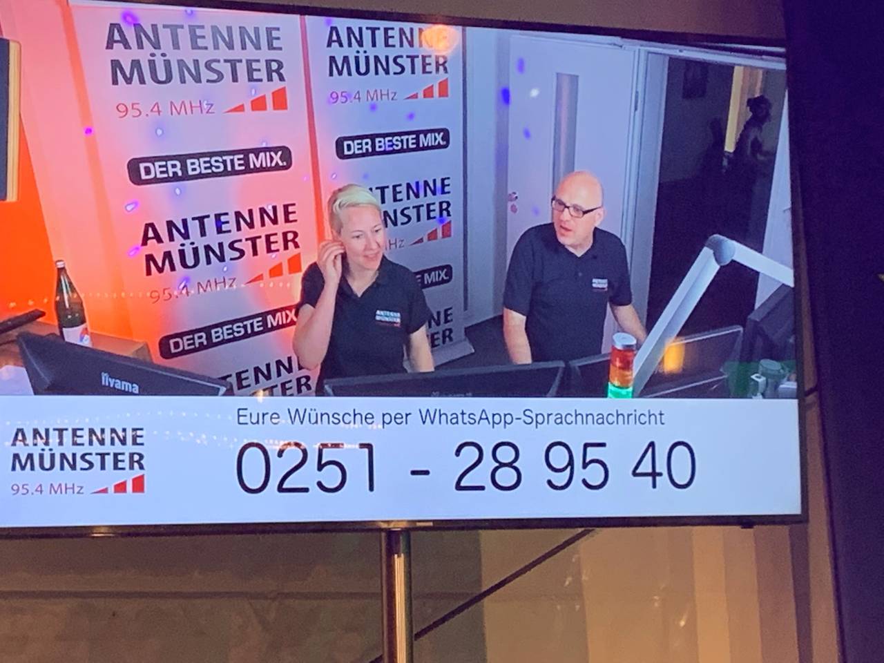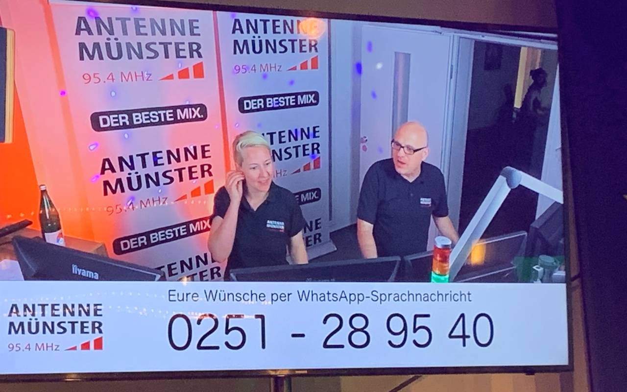 Auf den bunt leuchtenden Kopfhörern gab es drei Kanäle: Die Farbe "Grün" stand für DJ Costa Rica aus der Gazelle, "Rot" leuchtete der Kanal von DJ Q aus dem Heaven, und die Farbe "Blau" war das Zeichen dafür, dass die Musik live aus dem Radio kam - von den ANTENNE MÜNSTER-Morgenmoderatoren Anja Brukner und Christoph Hausdorf.