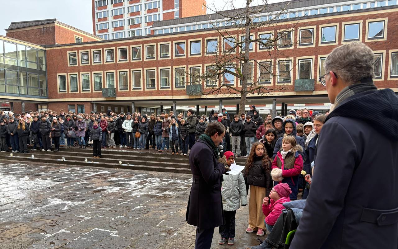 Im Rathausinnenhof hat es am Mittag, um 11:30 Uhr, eine Gedenkstunde gegeben, an der unter anderem Schülerinnen und Schülern und Oberbürgermeister Tilman Fuchs teilnahmen. Tilman Fuchs: