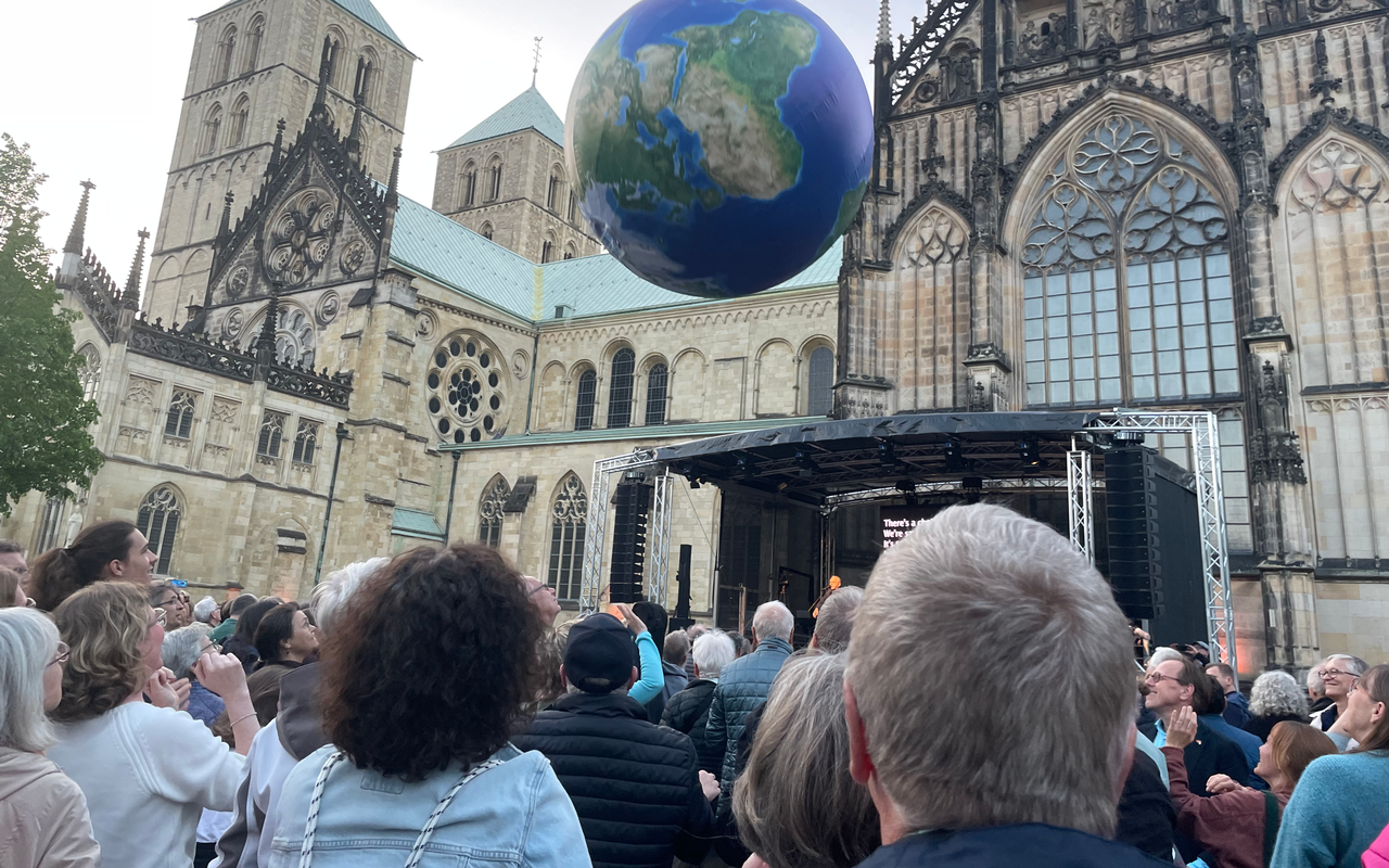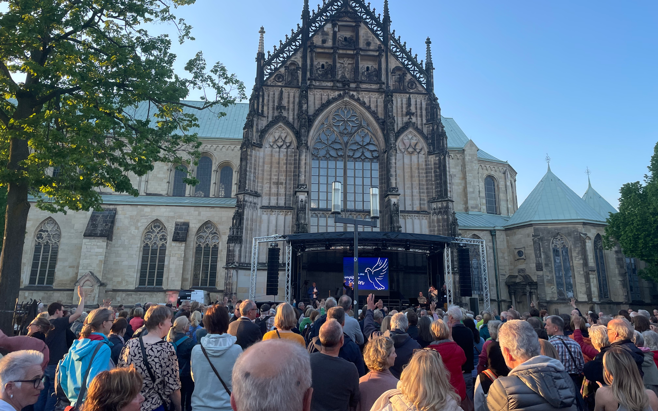 Am Abend sind deutlich mehr als 1.000 Menschen zum Rudelsingen auf dem Domplatz zusammengekommen. Anlass war der Auftakt für das Jubiläumsjahr "375 Jahre Westfälischer Frieden".