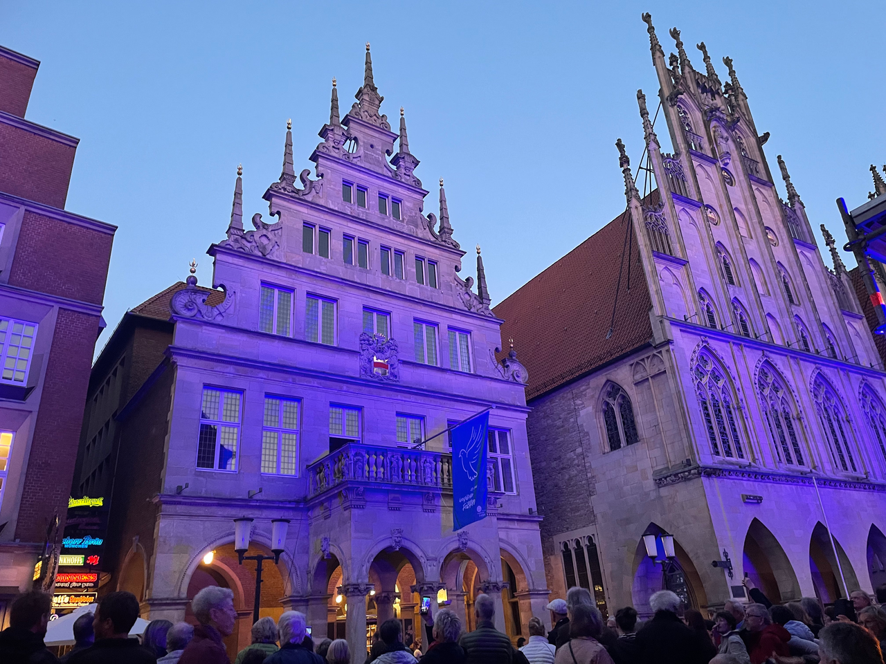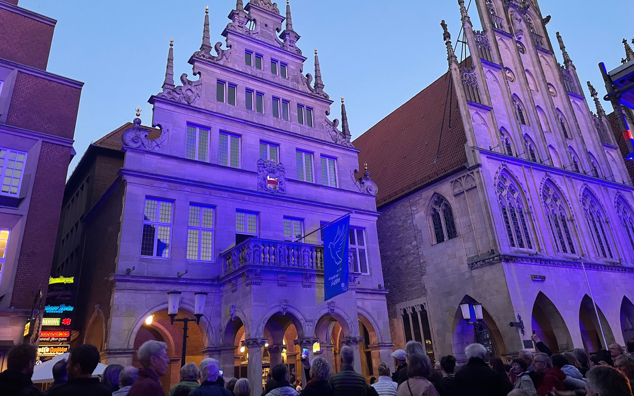 Passend zur Atmosphäre hat die Stadt das Rathaus und die Giebelhäuser zwischen Rathaus und Lambertikirche erleuchtet. Das Wort "Frieden" war auf den Fassaden in diversen Sprachen und Schriftarten zu lesen. Auch das Rathaus war in blaues Licht getaucht – dort zeigte sich das Logo des Jubiläumsjahres. Das Lichtspektakel können sich die Münsteraner:innen erneut vom 15. bis zum 20. Mai anschauen – jeweils von Beginn der Dämmerung an bis Mitternacht.