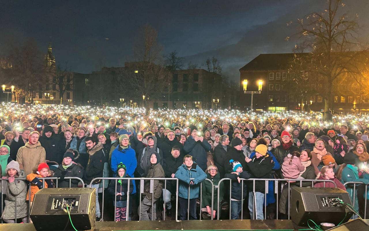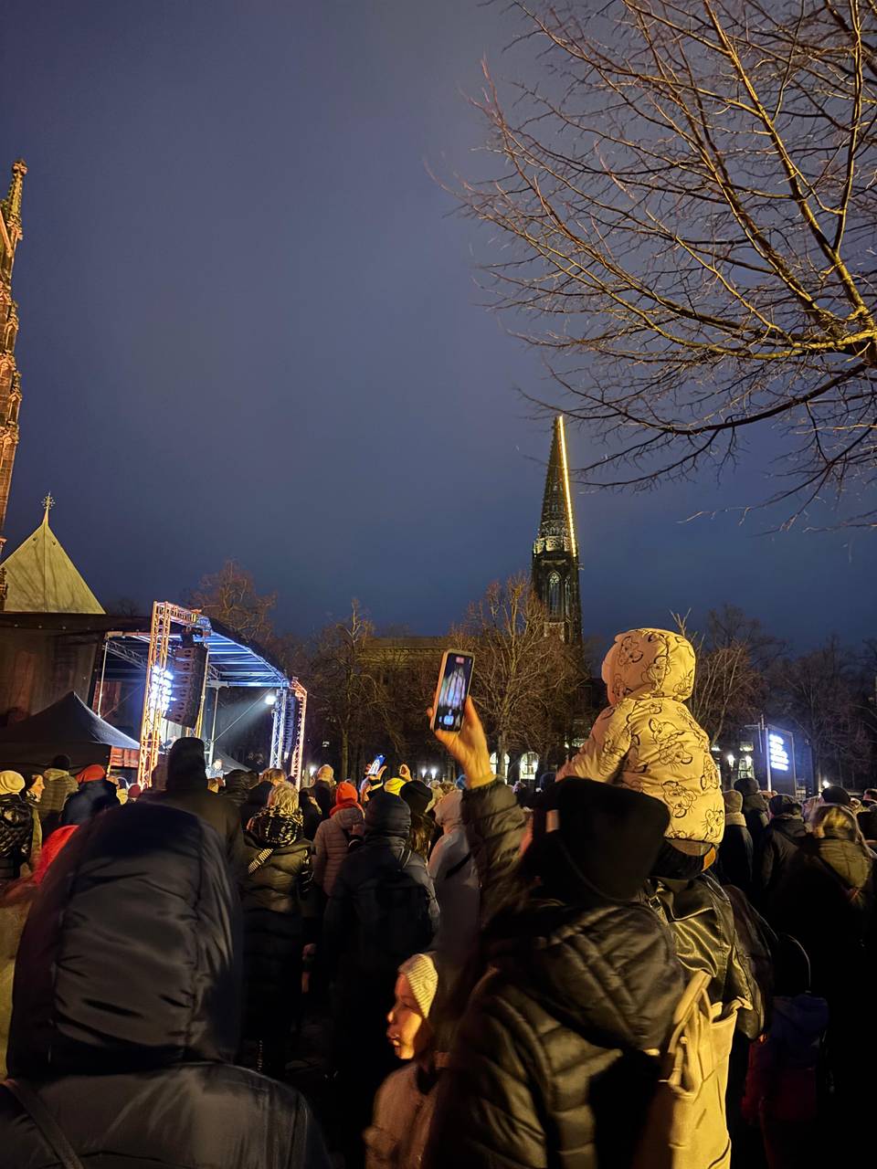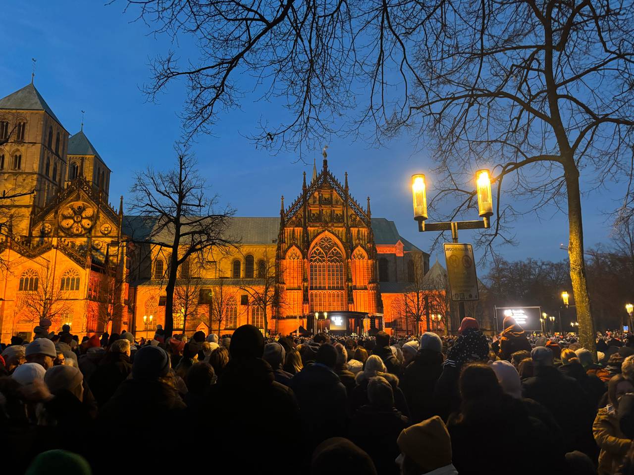 Besondere Stimmung kam dann bei "We are the world" auf. Ein Lichtermeer aus Taschenlampenlichtern füllte den Platz vor dem Dom, der selbst mit orange-roten Lichtern angestrahlt wurde. Dass es währenddessen ziemlich kalt wurde, war in der Menschenmenge kaum zu spüren. Viele Familien waren nicht zum ersten Mal beim Rudelsingen mit dabei und stimmten sich so auf Weihnachten ein. Fritz Schmücker, stellvertretender Leiter von Münster Marketing konstatierte schon bevor die letzten Lieder endeten:
