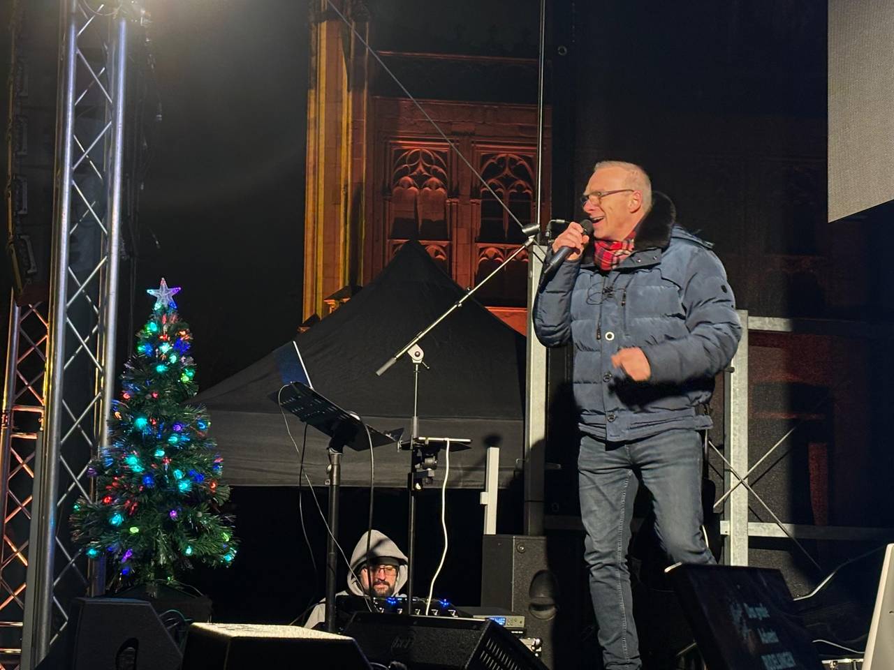 "Jetzt kann es Weihnachten werden", sagte eine Besucherin des diesjährigen Rudelsingens "Münster singt" auf dem Domplatz. Dabei wurde der Platz, der außer an Markttagen, doch sehr groß und fast schon leer wirkt, auf einmal ganz gemütlich. Mehr als 10.000 Menschen kamen laut einer Schätzung der Veranstalter hier am Sonntag (08.12.) zusammen, um gemeinsam mit David Rauterberg, dem Gründer des Rudelsingens, Weihnachtslieder anzustimmen. Von "Dicke Rote Kerzen" und "Kling Glöckchen" bis zu "Last Christmas" und John Lennons "Happy X Mas" war alles mit dabei. Und die Münsteraner:innen sangen mit Begeisterung: Bis auf den Prinzipalmarkt waren ihre Stimmen zu hören.